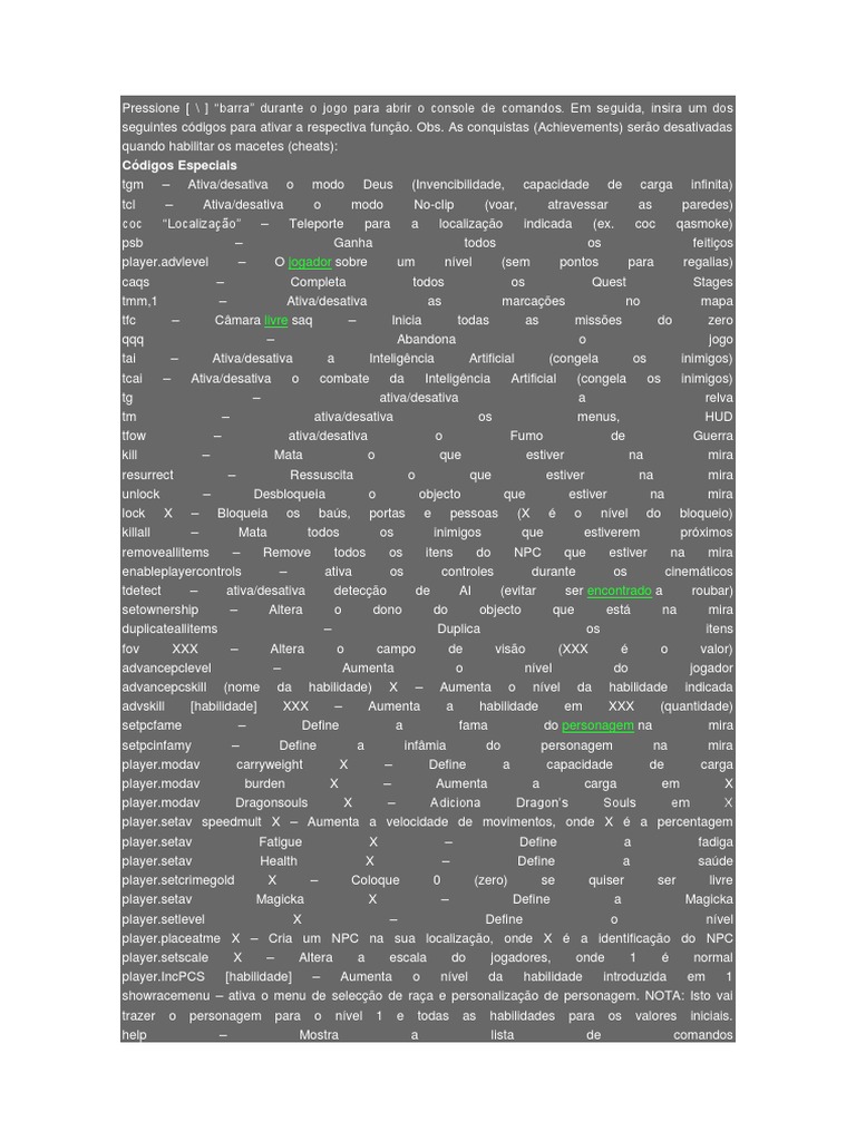 Em seguida, insira um dos seguintes cdigos para ativar a respectiva funo. Obs. As conquistas (Achievements) sero desativadas quando habilitar os macetes (cheats): Cdigos Especiais tgm tcl coc psb [Link] caqs tmm,1 tfc qqq tai tcai tg tm tfow kill resurrect unlock lock killall X Bloqueia Mata Altera (nome Altera da XXX Define X X X X X X X Altera o a Coloque X escala o e do nvel as 0 burden Dragonsouls Fatigue Health X Magicka a o habilidade) Define campo X a infmia Define Aumenta Adiciona (zero) Define jogadores, da onde Aumenta Aumenta a Mata Ressuscita Desbloqueia os bas, todos todos ativa deteco o dono o portas os os os de do de o Aumenta fama do a a Dragons Define Define se Define a o 1 o Ativa/desativa Ativa/desativa ativa/desativa o o objecto e pessoas inimigos itens AI Duplica viso nvel nvel da em habilidade do controles objecto o a combate Ativa/desativa Ativa/desativa o modo o Teleporte Deus modo para Ganha O jogador sobre Completa Ativa/desativa Inicia Abandona Inteligncia da ativa/desativa ativa/desativa o que que que (X que NPC (evitar durante que os (XXX do habilidade XXX o os Fumo estiver estiver estiver o que nvel estiverem estiver os est Artificial Inteligncia Artificial um todos as todas (Invencibilidade, No-clip a (voar, todos nvel (sem os marcaes as misses o (congela (congela a menus, de na na na do os os localizao capacidade indicada de (ex. os pontos Quest no do para carga as coc infinita) paredes) qasmoke) feitios regalias) Stages mapa zero jogo inimigos) inimigos) relva HUD Guerra mira mira mira bloqueio) prximos na mira roubar) mira itens valor) jogador indicada mira na de em em mira carga X X fadiga sade ser livre Magicka nvel normal em 1 (quantidade) cinemticos na atravessar