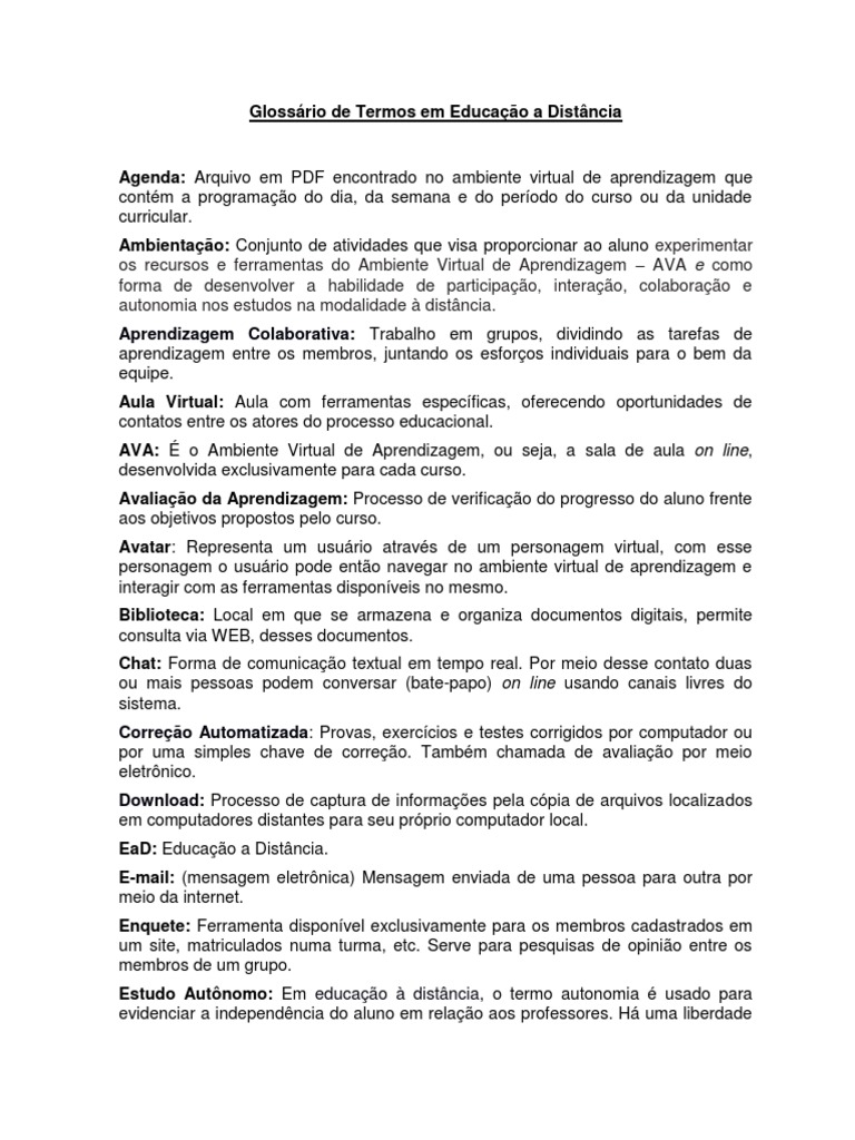 Agenda: Arquivo em PDF encontrado no ambiente virtual de aprendizagem que contm a programao do dia, da semana e do perodo do curso ou da unidade curricular. Ambientao: Conjunto de atividades que visa proporcionar ao aluno experimentar os recursos e ferramentas do Ambiente Virtual de Aprendizagem AVA e como forma de desenvolver a habilidade de participao, interao, colaborao e autonomia nos estudos na modalidade distncia. Aprendizagem Colaborativa: Trabalho em grupos, dividindo as tarefas de aprendizagem entre os membros, juntando os esforos individuais para o bem da equipe. Aula Virtual: Aula com ferramentas especficas, oferecendo oportunidades de contatos entre os atores do processo educacional. AVA: o Ambiente Virtual de Aprendizagem, ou seja, a sala de aula on line, desenvolvida exclusivamente para cada curso. Avaliao da Aprendizagem: Processo de verificao do progresso do aluno frente aos objetivos propostos pelo curso. Avatar: Representa um usurio atravs de um personagem virtual, com esse personagem o usurio pode ento navegar no ambiente virtual de aprendizagem e interagir com as ferramentas disponveis no mesmo. Biblioteca: Local em que se armazena e organiza documentos digitais, permite consulta via WEB, desses documentos. Chat: Forma de comunicao textual em tempo real. Por meio desse contato duas ou mais pessoas podem conversar (bate-papo) on line usando canais livres do sistema. Correo Automatizada: Provas, exerccios e testes corrigidos por computador ou por uma simples chave de correo. Tambm chamada de avaliao por meio eletrnico. Download: Processo de captura de informaes pela cpia de arquivos localizados em computadores distantes para seu prprio computador local. EaD: Educao a Distncia. E-mail: (mensagem eletrnica) Mensagem enviada de uma pessoa para outra por meio da internet. Enquete: Ferramenta disponvel exclusivamente para os membros cadastrados em um site, matriculados numa turma, etc. Serve para pesquisas de opinio entre os membros de um grupo. Estudo Autnomo: Em educao distncia, o termo autonomia usado para evidenciar a independncia do aluno em relao aos professores. H uma liberdade