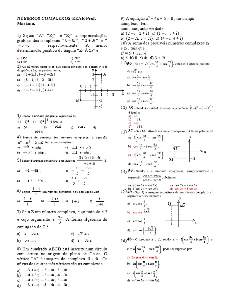 NMEROS COMPLEXOS-EEAR-Prof. Mariano. 1) Sejam A, Z1 e Z2 as representaes grficas dos complexos 0 + 0i , 2 + i e !