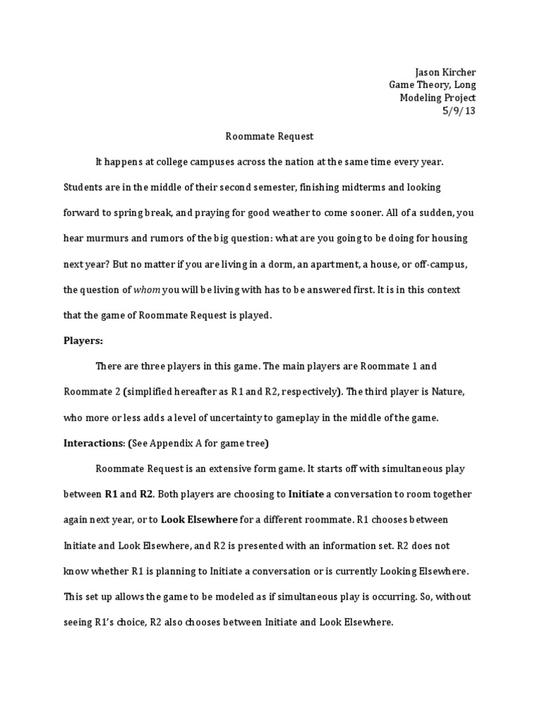 nation at the same time every year. Students are in the middle of their second semester, finishing midterms and looking forward to spring break, and praying for good weather to come sooner. All of a sudden, you hear murmurs and rumors of the big question: what are you going to be doing for housing next year? But no matter if you are living in a dorm, an apartment, a house, or off-campus, the question of whom you will be living with has to be answered first. It is in this context that the game of Roommate Request is played. Players: There are three players in this game. The main players are Roommate 1 and Roommate 2 (simplified hereafter as R1 and R2, respectively). The third player is Nature, who more or less adds a level of uncertainty to gameplay in the middle of the game. Interactions: (See Appendix A for game tree) Roommate Request is an extensive form game. It starts off with simultaneous play between R1 and R2. Both players are choosing to Initiate a conversation to room together again next year, or to Look Elsewhere for a different roommate. R1 chooses between Initiate and Look Elsewhere, and R2 is presented with an information set. R2 does not know whether R1 is planning to Initiate a conversation or is currently Looking Elsewhere. This set up allows the game to be modeled as if simultaneous play is occurring. So, without seeing R1s choice, R2 also chooses between Initiate and Look Elsewhere.
