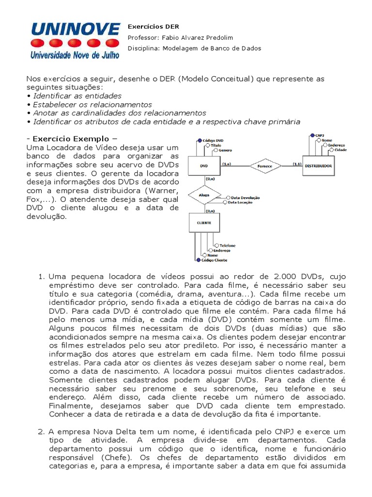 Nos exerccios a seguir, desenhe o DER (Modelo Conceitual) que represente as