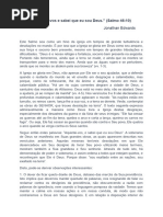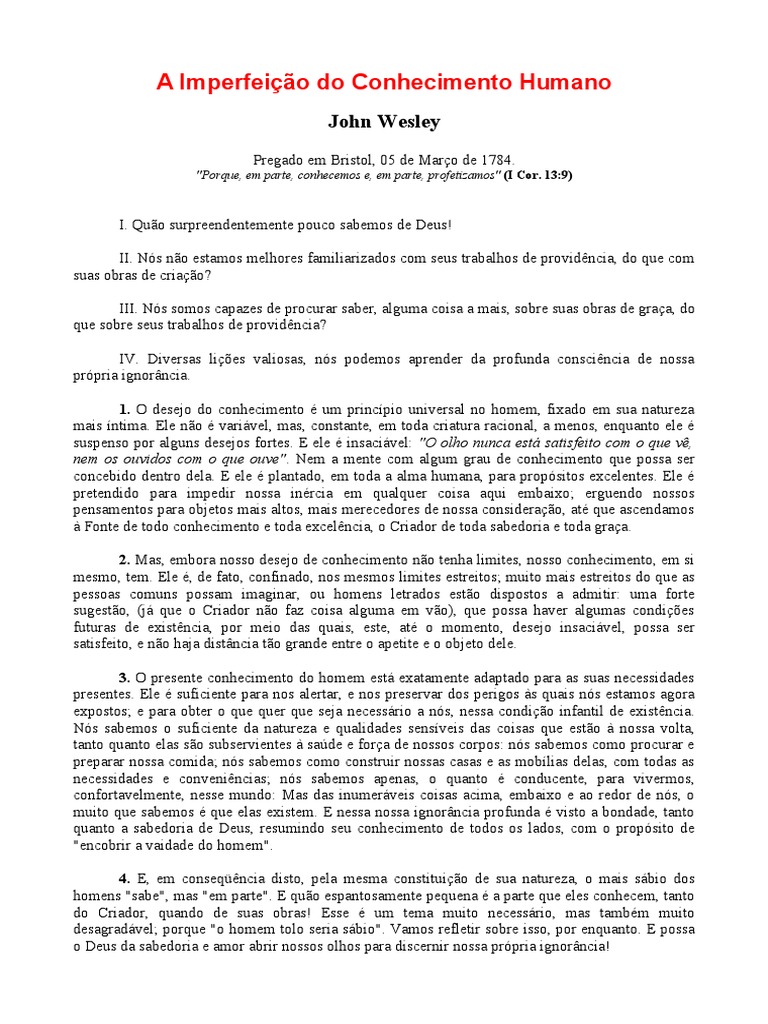 I. Quo surpreendentemente pouco sa emos de !eus" II. #$s no estamos mel%ores &amiliari'ados com seus tra al%os de pro(id)ncia, do *ue com suas o ras de criao+ III. #$s somos capa'es de procurar sa er, alguma coisa a mais, so re suas o ras de graa, do *ue so re seus tra al%os de pro(id)ncia+ I,. !i(ersas li-es (aliosas, n$s podemos aprender da pro&unda consci)ncia de nossa pr$pria [Link]. 1. / dese0o do con%ecimento 1 um princ2pio uni(ersal no %omem, &i3ado em sua nature'a mais 2ntima. 4le no 1 (ari5(el, mas, constante, em toda criatura racional, a menos, en*uanto ele 1 suspenso por alguns dese0os &ortes. 4 ele 1 insaci5(el6 "O olho nunca est satisfeito com o que v, nem os ouvidos com o que ouve". #em a mente com algum grau de con%ecimento *ue possa ser conce ido dentro dela. 4 ele 1 plantado, em toda a alma %umana, para prop$sitos e3celentes. 4le 1 pretendido para impedir nossa in1rcia em *ual*uer coisa a*ui em ai3o7 erguendo nossos pensamentos para o 0etos mais altos, mais merecedores de nossa considerao, at1 *ue ascendamos 8 9onte de todo con%ecimento e toda e3cel)ncia, o :riador de toda sa edoria e toda graa. 2. Mas, em ora nosso dese0o de con%ecimento no ten%a limites, nosso con%ecimento, em si mesmo, tem. 4le 1, de &ato, con&inado, nos mesmos limites estreitos7 muito mais estreitos do *ue as pessoas comuns possam imaginar, ou %omens letrados esto dispostos a admitir6 uma &orte sugesto, ;05 *ue o :riador no &a' coisa alguma em (o<, *ue possa %a(er algumas condi-es &uturas de e3ist)ncia, por meio das *uais, este, at1 o momento, dese0o insaci5(el, possa ser satis&eito, e no %a0a [Link] to grande entre o apetite e o o 0eto dele. 3. / presente con%ecimento do %omem est5 e3atamente adaptado para as suas necessidades presentes. 4le 1 su&iciente para nos alertar, e nos preser(ar dos perigos 8s *uais n$s estamos agora e3postos7 e para o ter o *ue *uer *ue se0a necess5rio a n$s, nessa condio in&antil de e3ist)ncia. #$s sa emos o su&iciente da nature'a e *ualidades sens2(eis das coisas *ue esto 8 nossa (olta, tanto *uanto elas so su ser(ientes 8 sa=de e &ora de nossos corpos6 n$s sa emos como procurar e preparar nossa comida7 n$s sa emos como construir nossas casas e as mo 2lias delas, com todas as necessidades e con(eni)ncias7 n$s sa emos apenas, o *uanto 1 conducente, para (i(ermos, con&orta(elmente, nesse mundo6 Mas das inumer5(eis coisas acima, em ai3o e ao redor de n$s, o muito *ue sa emos 1 *ue elas e3istem. 4 nessa nossa [Link] pro&unda 1 (isto a ondade, tanto *uanto a sa edoria de !eus, resumindo seu con%ecimento de todos os lados, com o prop$sito de >enco rir a (aidade do %omem>. 4. 4, em conse*?)ncia disto, pela mesma constituio de sua nature'a, o mais s5 io dos %omens >sa e>, mas >em parte>. 4 *uo espantosamente pe*uena 1 a parte *ue eles con%ecem, tanto do :riador, *uando de suas o ras" 4sse 1 um tema muito necess5rio, mas tam 1m muito desagrad5(el7 por*ue >o %omem tolo seria s5 io>. ,amos re&letir so re isso, por en*uanto. 4 possa o !eus da sa edoria e amor a rir nossos ol%os para discernir nossa pr$pria [Link]"