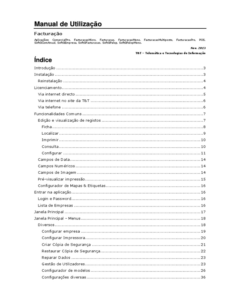 Introduo ........................................................................................................... 3 Instalao ............................................................................................................ 3 Reinstalao ...................................................................................................... 4 Licenciamento....................................................................................................... 4 Via internet directo ............................................................................................. 5 Via internet no site da T&T .................................................................................. 6 Via telefone ....................................................................................................... 6 Funcionalidades Comuns ........................................................................................ 7 Edio e visualizao de registos .......................................................................... 7 Ficha .............................................................................................................. 8 Localizar ......................................................................................................... 9 Imprimir ....................................................................................................... 10 Consulta ....................................................................................................... 10 Configurar .................................................................................................... 11 Campos de Data ............................................................................................... 14 Campos Numricos ........................................................................................... 14 Campos de Imagem .......................................................................................... 14 Pr-visualizar impresso .................................................................................... 15 Configurador de Mapas & Etiquetas ..................................................................... 16 Entrar na aplicao .............................................................................................. 16 Login e Password.............................................................................................. 16 Lista de Empresas ............................................................................................ 16 Janela Principal ................................................................................................... 17 Janela Principal - Menus ....................................................................................... 18 Diversos .......................................................................................................... 18 Configurar empresa ....................................................................................... 19 Configurar Impressora.................................................................................... 20 Criar Cpia de Segurana ............................................................................... 21 Restaurar Cpia de Segurana......................................................................... 22 Reparar Dados .............................................................................................. 23 Gesto de Utilizadores .................................................................................... 23 Configurador de modelos ................................................................................ 26 Configuraes diversas ................................................................................... 36