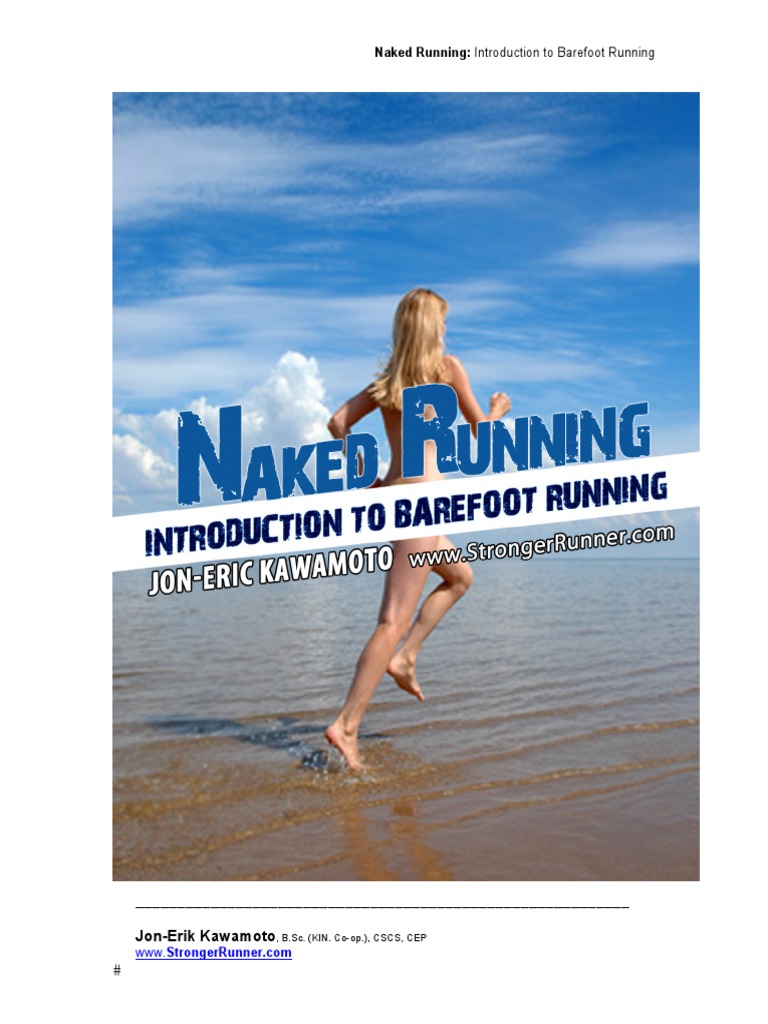 Title: Naked Running: An Introduction to Barefoot Running Edition: 1st edition (September 2010) 2nd edition (November 2010) Author: Kawamoto, Jon-Erik Key words: barefoot running, running injuries, strength training, Vibram Fivefingers, Nike Free, minimalist running All rights reserved, except for use in a review. The reproduction or use of the content from this book in any form (electronic, mechanical, or other) is prohibited. Photocopying or scanning any information into a storage or retrieval system is forbidden without the written permission of the publisher and author. Published by: JKConditioning Unit 64 7088 17th Ave. Burnaby, BC, Canada V3N 1K5 E-mail: jonerikkawamoto@gmail.com Webpage: http://www.JKConditioning.com and http://www.StrongerRunner.com Phone: (604) 374-5805