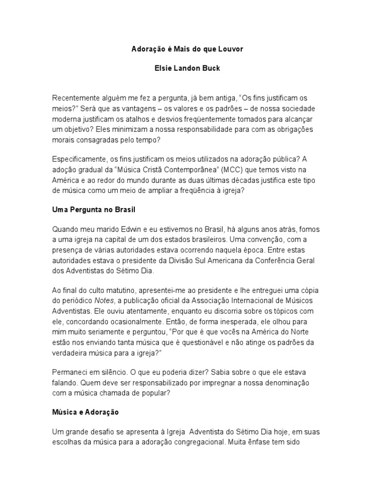 Recentemente algum me fez a pergunta, j bem antiga, Os fins justificam os meios? Ser que as vantagens os valores e os pa r!es e nossa socie a e mo erna justificam os atal"os e esvios freq#entemente toma os para alcan$ar um objetivo? %les minimizam a nossa responsabili a e para com as obriga$!es morais consagra as pelo tempo? %specificamente, os fins justificam os meios utiliza os na a ora$&o p'blica? ( a o$&o gra ual a )'sica *rist& *ontempor+nea ,)**- que temos visto na (mrica e ao re or o mun o urante as uas 'ltimas ca as justifica este tipo e m'sica como um meio e ampliar a freq#.ncia / igreja? Uma Pergunta no Brasil 0uan o meu mari o % 1in e eu estivemos no 2rasil, " alguns anos atrs, fomos a uma igreja na capital e um os esta os brasileiros3 4ma conven$&o, com a presen$a e vrias autori a es estava ocorren o naquela poca3 %ntre estas autori a es estava o presi ente a 5ivis&o Sul (mericana a *onfer.ncia 6eral os ( ventistas o Stimo 5ia3 (o final o culto matutino, apresentei7me ao presi ente e l"e entreguei uma c8pia o peri8 ico Notes, a publica$&o oficial a (ssocia$&o 9nternacional e )'sicos ( ventistas3 %le ouviu atentamente, enquanto eu iscorria sobre os t8picos com ele, concor an o ocasionalmente3 %nt&o, e forma inespera a, ele ol"ou para mim muito seriamente e perguntou, :or que que voc.s na (mrica o ;orte est&o nos envian o tanta m'sica que questionvel e n&o atinge os pa r!es a ver a eira m'sica para a igreja? :ermaneci em sil.ncio3 O que eu po eria izer? Sabia sobre o que ele estava falan o3 0uem eve ser responsabiliza o por impregnar a nossa enomina$&o com a m'sica c"ama a e popular? Msica e Adorao 4m gran e esafio se apresenta / 9greja ( ventista o Stimo 5ia "oje, em suas escol"as a m'sica para a a ora$&o congregacional3 )uita .nfase tem si o