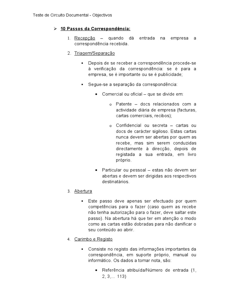 . Tria!em"#eparao Depois de se receber a correspondncia procede-se $ veri%icao da correspondncia& se ' para a empresa( se ' importante ou se ' publicidade) #e!ue-se a separao da correspondncia& Comercial ou o%icial que se divide em& o *atente docs relacionados com a actividade diria de empresa +%acturas( cartas comerciais( recibos,) o Con%idencial ou secreta cartas ou docs de carcter si!iloso. -stas cartas nunca devem ser abertas por quem as recebe( mas sim serem condu.idas directamente $ direco( depois de re!istada a sua entrada( em livro pr/prio. *articular ou pessoal estas no devem ser abertas e devem ser diri!idas aos respectivos destinatrios.