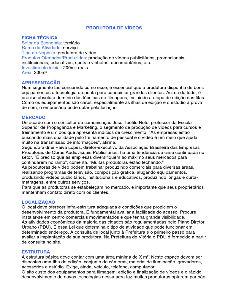 adquiri-los. Essa deciso, geralmente, tomada com base nos clientes e nos trabalhos que cada empresa desenvolve. EQUIPAMENTOS Os equipamentos bsicos so: - Seqenciadores por computador; - Microfones; - Mesa de som e sistema de amplificao; - Processadores de efeitos sonoros; - Microcomputadores; - Cmeras de filmagens, etc. INVESTIMENTOS O investimento varia muito de acordo com o porte do empreendimento e do quantitativo de que dispe o investidor. Considerando uma produtora de pequeno porte, montada numa rea de 300m, ser necessrio um investimento de R$200mil aproximadamente. Vale ressaltar que o investimento numa produtora alto devido aos equipamentos. Esse custo cai quando o empreendedor opta por alugar alguns deles. Obs.: os valores apresentados so indicativos e servem de base para o empresrio decidir se vale ou no a pena aprofundar a anlise de investimento. Investindo em INFORMATIZAO Uma empresa informatizada tem grandes chances de sair na frente do concorrente. Alm de facilitar os processos, garantem a segurana na tomada de decises, melhora a produtividade e diminui os gastos. Escolha um projeto abrangente que atenda toda a empresa, desde o gerenciamento de contedo para websites, at os controles administrativos (financeiro, estoque, caixa, cadastro de clientes, etc.). Existem no mercado atualmente, trs grandes grupos de softwares: SGE Sistema de Gesto Empresarial; SGC Sistema de Gerenciamento de Clientes e Bsicos. Eles podem ser encontrados nas empresas especializadas ou na Internet, atravs dos sistemas disponibilizados nas Provedoras de Servios de Software (ASP - application service provider). PESSOAL As atividades de uma produtora de vdeo podem ser iniciadas com oito pessoas no processo produtivo e quatro na administrao e vendas. PROCESSOS PRODUTIVOS Aluguel e Parcerias - A Zero Filmes aluga todos os equipamentos que precisa para a realizao de seus filmes publicitrios. "Para cada produo necessrio um equipamento especfico", comenta Neco Schertel, um dos scios da empresa. De acordo com ele, essa terceirizao tambm possibilita que a produtora busque parcerias com empresas at de outros pases. "Essa maleabilidade traz benefcios para o mercado, que se movimenta com isso", diz. Schertel cita o exemplo de um comercial produzido pela Zero Filmes que foi gravado no Uruguai, editado na Argentina e est sendo finalizado no Brasil. "O importante saber onde procurar essas parcerias e, para isso, preciso conhecer bem as empresas do ramo". Locao - A opo da M2 Comunicao Integrada foi pela compra dos equipamentos. Com isso, a produtora consegue tambm mais uma fonte de renda por meio da locao