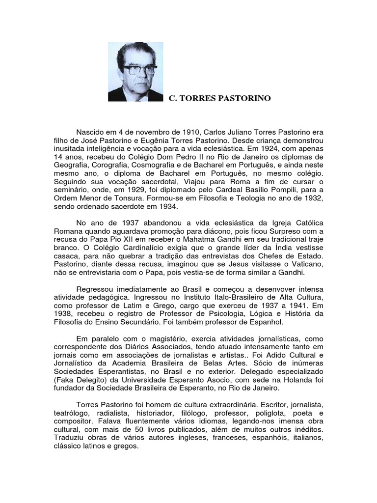 Nascido em 4 de novembro de 1910, Carlos Juliano Torres Pastorino era filho de Jos Pastorino e Eugnia Torres Pastorino. Desde criana demonstrou inusitada inteligncia e vocao para a vida eclesistica. Em 1924, com apenas 14 anos, recebeu do Colgio Dom Pedro II no Rio de Janeiro os diplomas de Geografia, Corografia, Cosmografia e de Bacharel em Portugus, e ainda neste mesmo ano, o diploma de Bacharel em Portugus, no mesmo colgio. Seguindo sua vocao sacerdotal, Viajou para Roma a fim de cursar o seminrio, onde, em 1929, foi diplomado pelo Cardeal Baslio Pompili, para a Ordem Menor de Tonsura. Formou-se em Filosofia e Teologia no ano de 1932, sendo ordenado sacerdote em 1934. No ano de 1937 abandonou a vida eclesistica da Igreja Catlica Romana quando aguardava promoo para dicono, pois ficou Surpreso com a recusa do Papa Pio XII em receber o Mahatma Gandhi em seu tradicional traje branco. O Colgio Cardinalcio exigia que o grande lder da ndia vestisse casaca, para no quebrar a tradio das entrevistas dos Chefes de Estado. Pastorino, diante dessa recusa, imaginou que se Jesus visitasse o Vaticano, no se entrevistaria com o Papa, pois vestia-se de forma similar a Gandhi. Regressou imediatamente ao Brasil e comeou a desenvover intensa atividade pedaggica. Ingressou no Instituto Italo-Brasileiro de Alta Cultura, como professor de Latim e Grego, cargo que exerceu de 1937 a 1941. Em 1938, recebeu o registro de Professor de Psicologia, Lgica e Histria da Filosofia do Ensino Secundrio. Foi tambm professor de Espanhol. Em paralelo com o magistrio, exercia atividades jornalsticas, como correspondente dos Dirios Associados, tendo atuado intensamente tanto em jornais como em associaes de jornalistas e artistas.. Foi Adido Cultural e Jornalstico da Academia Brasileira de Belas Artes. Scio de inmeras Sociedades Esperantistas, no Brasil e no exterior. Delegado especializado (Faka Delegito) da Universidade Esperanto Asocio, com sede na Holanda foi fundador da Sociedade Brasileira de Esperanto, no Rio de Janeiro. Torres Pastorino foi homem de cultura extraordinria. Escritor, jornalista, teatrlogo, radialista, historiador, fillogo, professor, poliglota, poeta e compositor. Falava fluentemente vrios idiomas, legando-nos imensa obra cultural, com mais de 50 livros publicados, alm de muitos outros inditos. Traduziu obras de vrios autores ingleses, franceses, espanhis, italianos, clssico latinos e gregos.