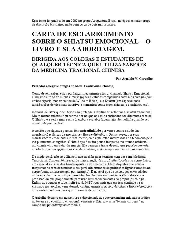 Por Arnaldo V. Carvalho Prezados colegas e amigos da Med. Tradicional Chinesa, Como devem saber, estou por lanar meu primeiro livro, chamado Shiatsu Emocional. O mesmo fruto de minhas investigaes e estudos comparados entre a psicologia (com nfase especial nos trabalhos de Wilhelm Reich), e o Shiatsu (em especial suas ramificaes de vis mais intuitivo e humanista como o zen shiatsu, o ohashiatsu etc). Gostaria de dizer que seu texto no pretende substituir ou reformar o shiatsu tradicional. Muito menos substituir ou ser melhor do que os estilos ensinados nas diferentes escolas. O Shiatsu e ser sempre um s, embora sua abordagem seja to mltipla quando seu nmero de praticantes. Acredito que algumas pessoas tm mais afinidade por vezes com o estudo das manifestaes fsicas da energia, seu fluxo e distrbios. Outras vezes, por suas manifestaes emocionais. E finalmente, h os que esto interessados no fenmeno pela via puramente energtica. O fato que muito pouco frequente, no mundo ocidental, um cliente vir para tratar da energia. Ele vem para tratar daquilo que percebe que esta errado. E sua percepo, suas vias de sinalizar, esto sempre no fsico ou nas emoes. De modo geral, no s o Shiatsu, mas as diferentes tcnicas com base em Medicina Tradicional Chinesa, tm recebido mais ateno das profisses focadas no corpo fsico, em especial a classe dos fisioterapeutas e dos mdicos. Alm daqueles que esto a frequentar as escolas tcnicas e em geral so oriundos de profisses ligadas tambm ao corpo (como a massoterapia por exemplo). notvel que os psiclogos enveredados nesta rea dominada pelo pensamento Oriental buscam mais uma alternativa sua profisso do que propriamente para usar seus conhecimentos na prpria psicologia. Enfim, aos poucos o saber holstico da MTC, por mais que em tese continue a ser ensinado nas escolas, vem atuando continuamente a servio da cincia fsica e biolgica em escalas muito maiores que no campo das emoes. O trabalho descrito em nosso livro direcionado aos que pretendem enfatizar a prtica no tocante ao equilbrio emocional, e inserir o Shiatsu uma terapia corporal no campo das psicoterapias corporais.