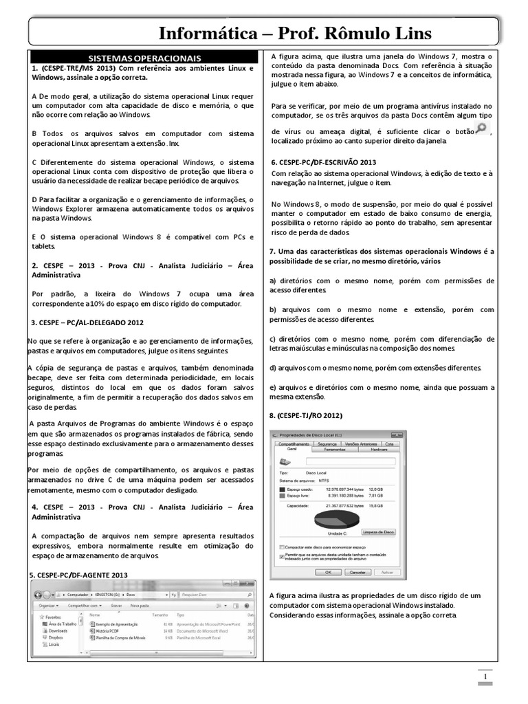 A Por meio do boto Limpeza de Disco, obtm-se recursos do Windows que permitem reduzir a quantidade de arquivos desnecessrios no disco rgido, liberando espao em disco, o que, em algumas situaes, contribui para tornar mais rpida a execuo de programas no computador. B Ao se clicar a aba Compartilhamento, ser disponibilizado, automaticamente, o contedo da pasta Windir, utilizada pelo Windows para armazenar todos os arquivos do computador que so compartilhados entre o computador e outros computadores que esto em rede. C Os dispositivos fsicos instalados no sistema operacional que so dependentes do disco rgido sero todos mostrados, em janela especfica, ao se clicar a aba Hardware. Por meio dos recursos disponibilizados nessa janela especfica, possvel realizar a configurao dos referidos dispositivos fsicos. D O sistema de arquivos NTFS, citado na figura, utilizado em sistemas Windows 2000, XP e Vista, ao passo que, no Windows 7, utiliza-se o sistema JFS. Diferentemente do que ocorre no sistema JFS, no sistema NTFS possvel ativar o recurso de compactao do disco rgido, para economizar espao em disco. E Ao se clicar a aba Ferramentas, ser disponibilizado, automaticamente, o aplicativo desfragmentador de disco que estiver instalado no referido computador, com o qual ser possvel remover arquivos temporrios do disco rgido e esvaziar, com segurana, a lixeira. 11. CESPE - 2013 - IBAMA - Analista Administrativo A respeito dos conceitos fundamentais de informtica, julgue os itens a seguir. O sistema operacional Linux pode ser utilizado, copiado, estudado, modificado e redistribudo sem restrio. Certo Errado 12. CESPE - 2013 - PC-BA - Delegado de Polcia Os sistemas Windows e Linux se assemelham na possibilidade de uso de interface de linha de comandos: o comando dir, no Windows, pode produzir listagem de arquivos em pasta ou diretrio, assim como o comando ls, no Linux. 13. CESPE - 2012 - TJ-AC - Tcnico Judicirio No Linux, os nomes de arquivos podem ter at 256 caracteres, porm o nome de arquivo Um_nome_arquivo_longo+uma_longa_exntenso invlido, pois o sinal + um caractere reservado e no pode ser usado. Certo Errado