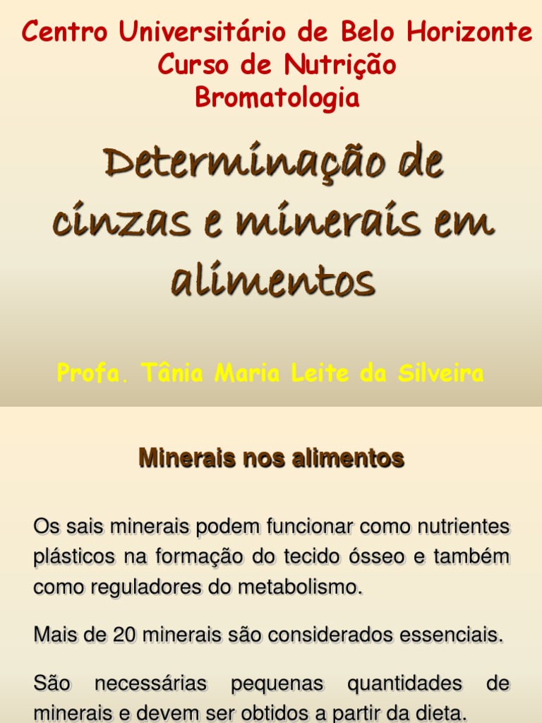 Pode-se determinar: Resduo mineral fixo ou cinzas totais (total solvel e insolvel). Anlise elementar constituintes minerais individuais.