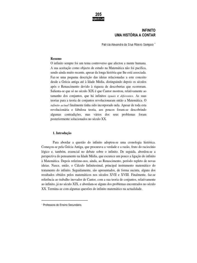 Resumo O infinito sempre foi um tema controverso que afectou a mente humana. A sua aceitao como objecto de estudo na Matemtica no foi pacfica, sendo ainda muito recente, apesar da longa histria que lhe est associada. Faz-se uma pequena descrio das ideias relacionadas a este conceito desde a Grcia antiga at Idade Mdia, distinguindo depois os sculos aps o Renascimento devido riqueza de descobertas que ocorreram. Salienta-se que s no sculo XIX que Cantor mostrou, relativamente ao tamanho dos conjuntos, que h infinitos iguais e diferentes. As suas teorias para a teoria de conjuntos revolucionaram ento a Matemtica. O infinito actual finalmente tinha sido incorporado nela. Apesar de toda esta revolucionria e fabulosa teoria, aos poucos foram-se descobrindo algumas contradies, mas vrios dos seus problemas foram posteriormente solucionados no sculo XX.