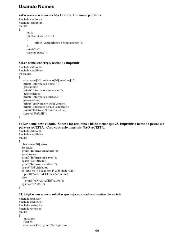 #include <stdio.h> #include <stdlib.h> main() { int x; for (x=1;x <=10; x++) { printf("\nAlgoritmos e Programacao "); } printf("\n"); system("pause"); }