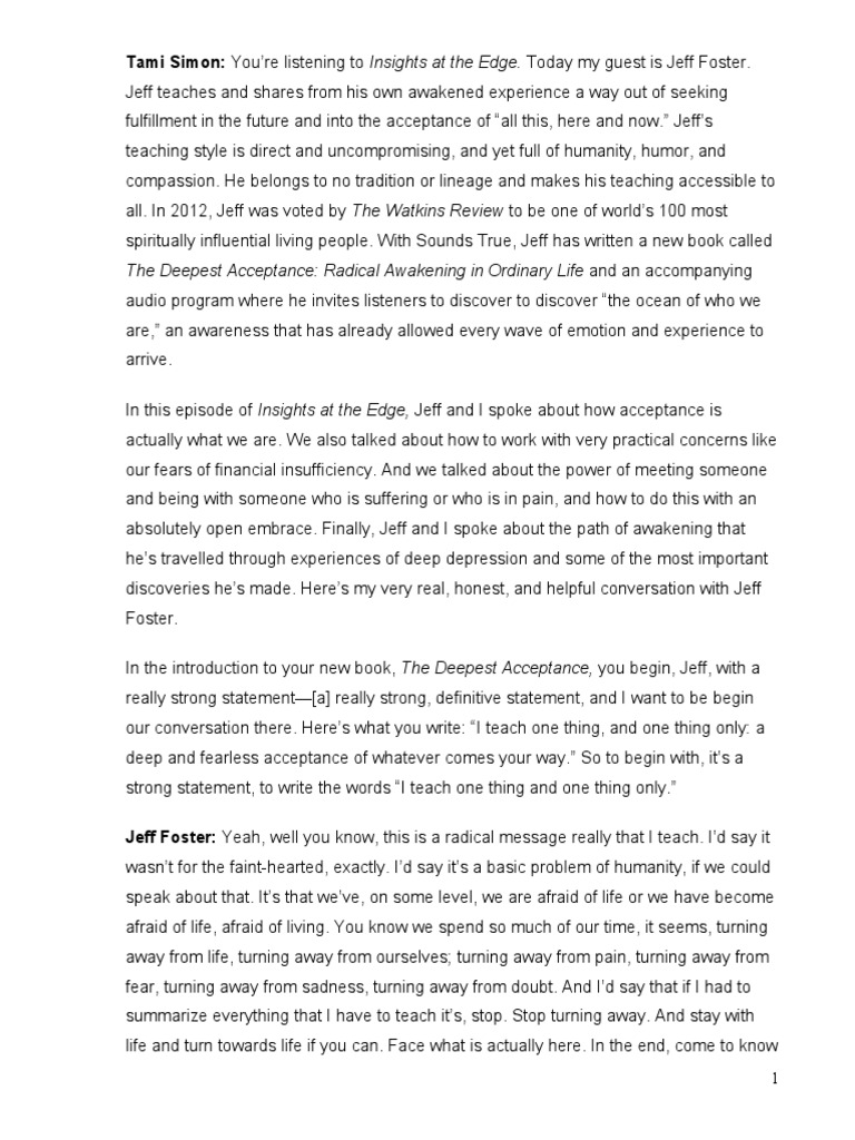 Jeff teaches and shares from his own awakened experience a way out of seeking fulfillment in the future and into the acceptance of all this, here and now. Jeffs teaching style is direct and uncompromising, and yet full of humanity, humor, and compassion. e !elongs to no tradition or lineage and makes his teaching accessi!le to all. "n #$%#, Jeff was &oted !y The Watkins Review to !e one of worlds %$$ most spiritually influential li&ing people. 'ith (ounds True, Jeff has written a new !ook called The Deepest Acceptance: Radical Awakening in Ordinary Life and an accompanying audio program where he in&ites listeners to disco&er to disco&er the ocean of who we are, an awareness that has already allowed e&ery wa&e of emotion and experience to arri&e. "n this episode of Insights at the Edge, Jeff and " spoke a!out how acceptance is actually what we are. 'e also talked a!out how to work with &ery practical concerns like our fears of financial insufficiency. )nd we talked a!out the power of meeting someone and !eing with someone who is suffering or who is in pain, and how to do this with an a!solutely open em!race. Finally, Jeff and " spoke a!out the path of awakening that hes tra&elled through experiences of deep depression and some of the most important disco&eries hes made. eres my &ery real, honest, and helpful con&ersation with Jeff Foster. "n the introduction to your new !ook, The Deepest Acceptance, you !egin, Jeff, with a really strong statement*+a, really strong, definiti&e statement, and " want to !e !egin our con&ersation there. eres what you write- " teach one thing, and one thing only- a deep and fearless acceptance of whate&er comes your way. (o to !egin with, its a strong statement, to write the words " teach one thing and one thing only. Jeff Foster: Yeah, well you know, this is a radical message really that " teach. "d say it wasnt for the faint.hearted, exactly. "d say its a !asic pro!lem of humanity, if we could speak a!out that. "ts that we&e, on some le&el, we are afraid of life or we ha&e !ecome afraid of life, afraid of li&ing. You know we spend so much of our time, it seems, turning away from life, turning away from oursel&es/ turning away from pain, turning away from fear, turning away from sadness, turning away from dou!t. )nd "d say that if " had to summari0e e&erything that " ha&e to teach its, stop. (top turning away. )nd stay with life and turn towards life if you can. Face what is actually here. "n the end, come to know 1