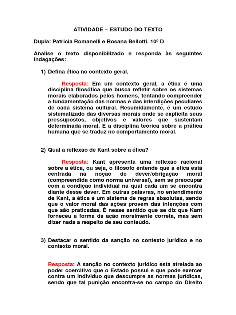 . 10 D Analise o texto disponibilizado e responda s seguintes indagaes: 1) Defina tica no contexto geral. Resposta: Em um contexto geral, a tica uma disciplina filosfica que busca refletir sobre os sistemas morais elaborados pelos homens, tentando compreender a fundamentao das normas e das interdies peculiares de cada sistema cultural. Resumidamente, um estudo sistematizado das diversas morais onde se explicita seus pressupostos, objetivos e valores que sustentam determinada moral. a disciplina terica sobre a prtica humana que se traduz no comportamento moral.