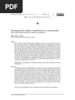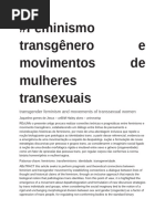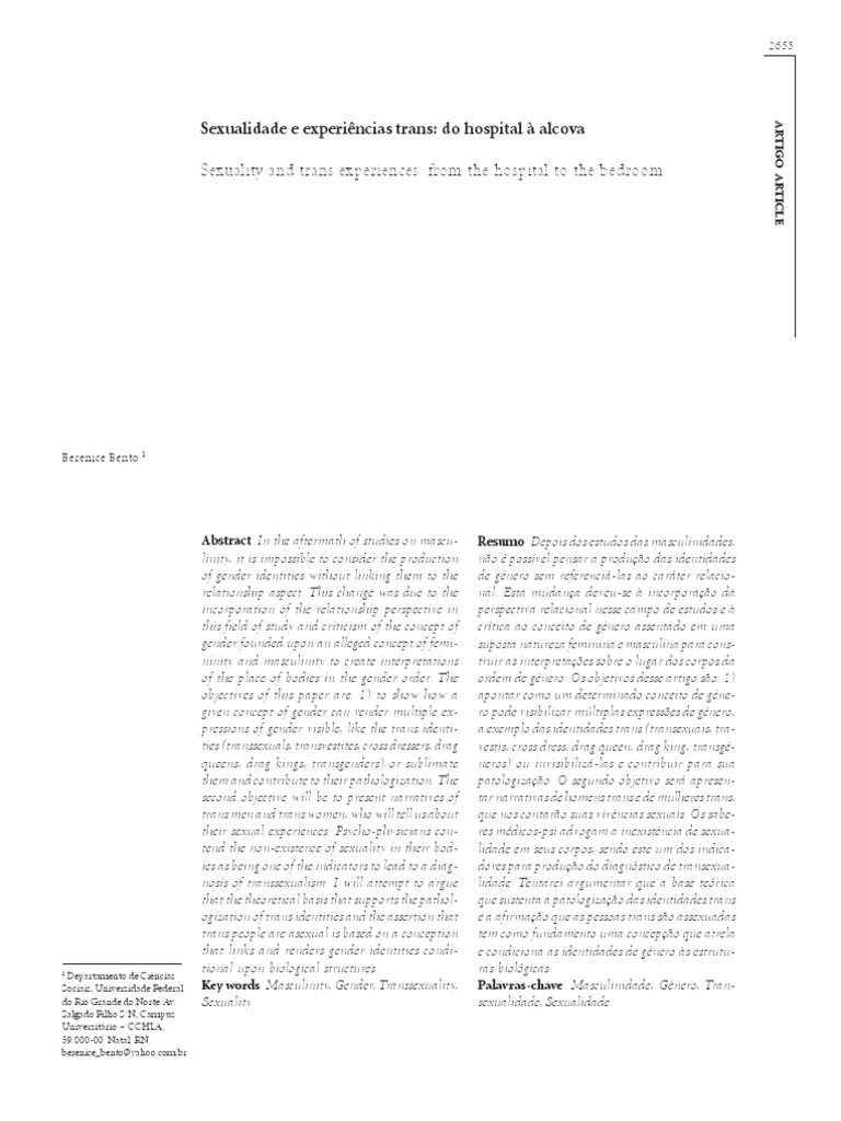 Resumo Depois dos estudos das masculinidades, no possvel pensar a produo das identidades de gnero sem referenci-las ao carter relacional. Esta mudana deveu-se incorporao da perspectiva relacional nesse campo de estudos e crtica ao conceito de gnero assentado em uma suposta natureza feminina e masculina para construir as interpretaes sobre o lugar dos corpos da ordem de gnero. Os objetivos desse artigo so: 1) apontar como um determinado conceito de gnero pode visibilizar mltiplas expresses de gnero, a exemplo das identidades trans (transexuais, travestis, cross dress, drag queen, drag king, transgneros) ou invisibiliz-las e contribuir para sua patologizao. O segundo objetivo ser apresentar narrativas de homens trans e de mulheres trans, que nos contaro suas vivncias sexuais. Os saberes mdicos-psi advogam a inexistncia de sexualidade em seus corpos, sendo este um dos indicadores para produo do diagnstico de transexualidade. Tentarei argumentar que a base terica que sustenta a patologizao das identidades trans e a afirmao que as pessoas trans so assexuadas tem como fundamento uma concepo que atrela e condiciona as identidades de gnero s estruturas biolgicas. Palavras-chave Masculinidade, Gnero, Transexualidade, Sexualidade