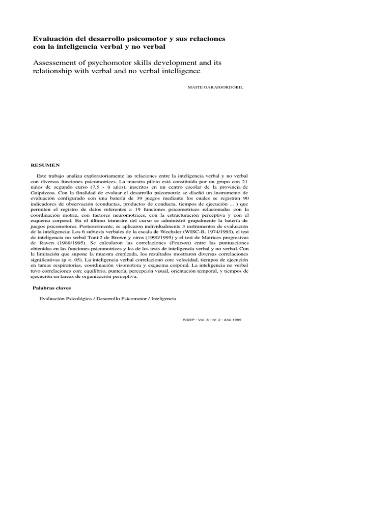 10 ABSTRACT This exploratory work studies the correlations between psychomotor development and intelligence. The study had been carried out with 21 children ages 7,5-8. Perceptual motor abilities and verbal-nonverbal intelligence were measured. First, it was designed a game's battery to evaluate psychomotor development. After applying the game's battery, three instruments were administered: Raven Progressive Matrices (Raven et al 1988/1995), Test of Nonverbal Intelligence (Brown et al 1990/1995), and Wechsler Intelligence Verbal Scale for Children Revised (1974/1993). After applying correlation analysis (Pearson), results showed some correlations between verbal intelligence and speed, performance times in respiration task, visuomotor coordination and body's knowledge. Nonverbal intelligence had significant correlations with balance, marksmanship, visual perception, temporal orientation and time in task of perceptive organization.