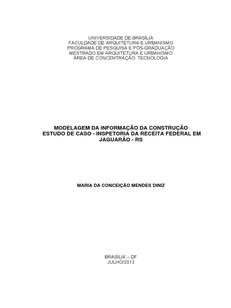 Dissertao apresentada no Curso de Ps-graduao em Arquitetura e Urbanismo da Universidade Federal de Braslia, como parte dos requisitos para obteno do ttulo de Mestre em Arquitetura e Urbanismo.