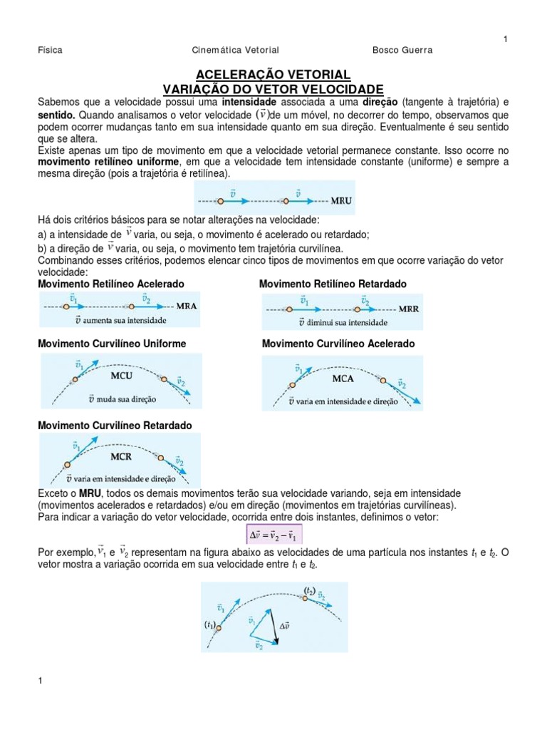 H dois critrios bsicos para se notar alteraes na velocidade: a) a intensidade de varia, ou seja, o movimento acelerado ou retardado; b) a direo de varia, ou seja, o movimento tem trajetria curvilnea. Combinando esses critrios, podemos elencar cinco tipos de movimentos em que ocorre variao do vetor velocidade: Movimento Retilneo Acelerado Movimento Retilneo Retardado