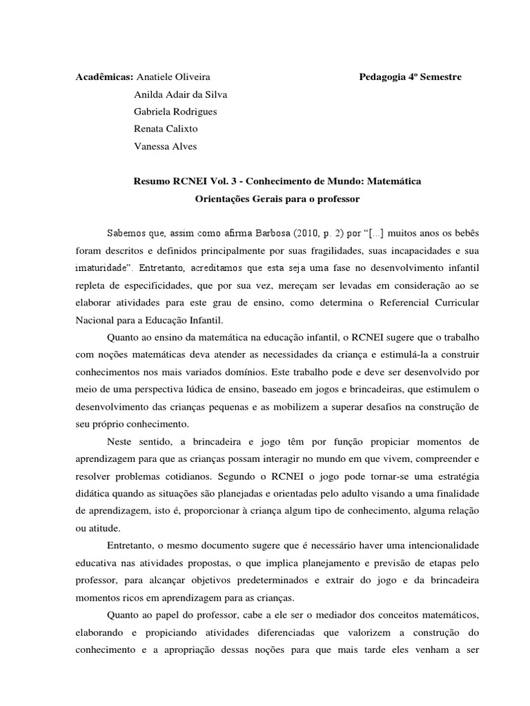 Resumo RCNEI Vol. 3 - Conhecimento de Mundo: Matemtica Orientaes Gerais para o professor Sabemos que, assim como afirma Barbosa (2010, p. 2) por [...] muitos anos os bebs foram descritos e definidos principalmente por suas fragilidades, suas incapacidades e sua imaturidade. Entretanto, acreditamos que esta seja uma fase no desenvolvimento infantil repleta de especificidades, que por sua vez, meream ser levadas em considerao ao se elaborar atividades para este grau de ensino, como determina o Referencial Curricular Nacional para a Educao Infantil. Quanto ao ensino da matemtica na educao infantil, o RCNEI sugere que o trabalho com noes matemticas deva atender as necessidades da criana e estimul-la a construir conhecimentos nos mais variados domnios. Este trabalho pode e deve ser desenvolvido por meio de uma perspectiva ldica de ensino, baseado em jogos e brincadeiras, que estimulem o desenvolvimento das crianas pequenas e as mobilizem a superar desafios na construo de seu prprio conhecimento. Neste sentido, a brincadeira e jogo tm por funo propiciar momentos de aprendizagem para que as crianas possam interagir no mundo em que vivem, compreender e resolver problemas cotidianos. Segundo o RCNEI o jogo pode tornar-se uma estratgia didtica quando as situaes so planejadas e orientadas pelo adulto visando a uma finalidade de aprendizagem, isto , proporcionar criana algum tipo de conhecimento, alguma relao ou atitude. Entretanto, o mesmo documento sugere que necessrio haver uma intencionalidade educativa nas atividades propostas, o que implica planejamento e previso de etapas pelo professor, para alcanar objetivos predeterminados e extrair do jogo e da brincadeira momentos ricos em aprendizagem para as crianas. Quanto ao papel do professor, cabe a ele ser o mediador dos conceitos matemticos, elaborando e propiciando atividades diferenciadas que valorizem a construo do conhecimento e a apropriao dessas noes para que mais tarde eles venham a ser