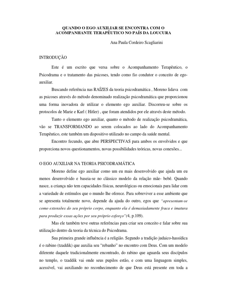 um escrito que versa sobre o Acompanhamento Teraputico, o Psicodrama e o tratamento das psicoses, tendo como fio condutor o conceito de egoauxiliar. Buscando referncia nas RAZES da teoria psicodramtica , Moreno lidava com as psicoses atravs do mtodo denominado realizao psicodramtica que proporcionou uma forma inovadora de utilizar o elemento ego auxiliar. Discorreu-se sobre os protocolos de Marie e Karl ( Hitler) , que foram atendidos por ele atravs deste mtodo. Tanto o elemento ego auxiliar, quanto o mtodo de realizao psicodramtica, vo se TRANSFORMANDO ao serem colocados ao lado do Acompanhamento Teraputico, este tambm um dispositivo utilizado no campo da sade mental. Encontro fecundo, que abre PERSPECTIVAS para ambos os envolvidos e que proporciona novos questionamentos, novas possibilidades tericas, novas conexes... O EGO AUXILIAR NA TEORIA PSICODRAMTICA Moreno define ego auxiliar como um eu mais desenvolvido que ajuda um eu menos desenvolvido e baseia-se no clssico modelo da relao me- beb. Quando nasce, a criana no tem capacidades fsicas, neurolgicas ou emocionais para lidar com a variedade de estmulos que o mundo lhe oferece. Para sobreviver a esse ambiente que se apresenta totalmente novo, depende da ajuda do outro, egos que apresentam-se como extenses do seu prprio corpo, enquanto ela demasiadamente fraca e imatura para produzir essas aes por seu prprio esforo(4, p.109). Mas ele tambm teve outras referncias para criar seu conceito e falar sobre sua utilizao dentro da teoria da tcnica do Psicodrama. Sua primeira grande influncia a religio. Segundo a tradio judaico-hassdica o rabino (tzaddik) que auxilia seu rebanho no encontro com Deus. Com um modelo diferente daquele tradicionalmente encontrado, do rabino que aguarda seus discpulos no templo, o tzaddik vai onde seus pupilos esto, e com uma linguagem simples, acessvel, vai auxiliando no reconhecimento de que Deus est presente em toda a