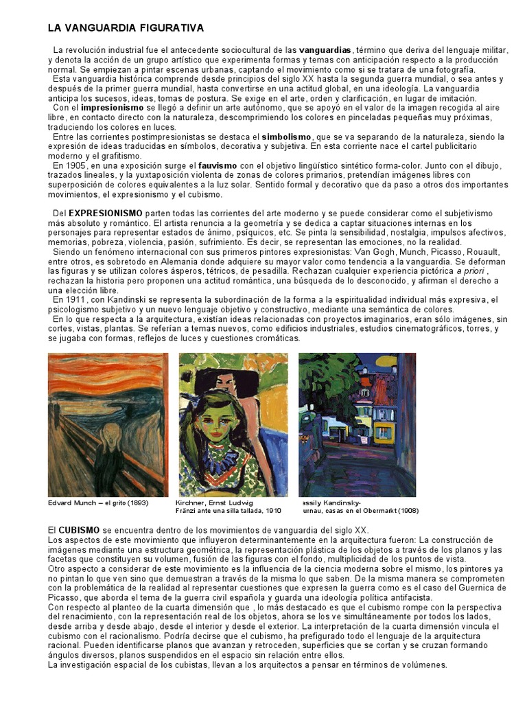 La revolución industrial fue el antecedente sociocultural de las vanguardias, término que deriva del lenguaje militar, y denota la acción de un grupo artístico que experimenta formas y temas con anticipación respecto a la producción normal. Se empiezan a pintar escenas urbanas, captando el movimiento como si se tratara de una fotografía. sta vanguardia !istórica comprende desde principios del siglo "" !asta la segunda guerra mundial, o sea antes y después de la primer guerra mundial, !asta convertirse en una actitud global, en una ideología. La vanguardia anticipa los sucesos, ideas, tomas de postura. Se exige en el arte, orden y clarificación, en lugar de imitación. #on el impresionismo se llegó a definir un arte autónomo, que se apoyó en el valor de la imagen recogida al aire libre, en contacto directo con la naturaleza, descomprimiendo los colores en pinceladas peque$as muy próximas, traduciendo los colores en luces. ntre las corrientes postimpresionistas se destaca el simbolismo, que se va separando de la naturaleza, siendo la expresión de ideas traducidas en símbolos, decorativa y subjetiva. n esta corriente nace el cartel publicitario moderno y el grafitismo. n %&'(, en una exposición surge el fauvismo con el objetivo ling)ístico sintético forma*color. +unto con el dibujo, trazados lineales, y la yuxtaposición violenta de zonas de colores primarios, pretendían im,genes libres con superposición de colores equivalentes a la luz solar. Sentido formal y decorativo que da paso a otros dos importantes movimientos, el expresionismo y el cubismo. -el EXPRE I!NI "! parten todas las corrientes del arte moderno y se puede considerar como el subjetivismo m,s absoluto y rom,ntico. l artista renuncia a la geometría y se dedica a captar situaciones internas en los personajes para representar estados de ,nimo, psíquicos, etc. Se pinta la sensibilidad, nostalgia, impulsos afectivos, memorias, pobreza, violencia, pasión, sufrimiento. s decir, se representan las emociones, no la realidad. Siendo un fenómeno internacional con sus primeros pintores expresionistas. /an 0og!, 1unc!, 2icasso, 3ouault, entre otros, es sobretodo en 4lemania donde adquiere su mayor valor como tendencia a la vanguardia. Se deforman las figuras y se utilizan colores ,speros, tétricos, de pesadilla. 3ec!azan cualquier experiencia pictórica a priori , rec!azan la !istoria pero proponen una actitud rom,ntica, una b5squeda de lo desconocido, y afirman el derec!o a una elección libre. n %&%%, con 6andins7i se representa la subordinación de la forma a la espiritualidad individual m,s expresiva, el psicologismo subjetivo y un nuevo lenguaje objetivo y constructivo, mediante una sem,ntica de colores. n lo que respecta a la arquitectura, existían ideas relacionadas con proyectos imaginarios, eran sólo im,genes, sin cortes, vistas, plantas. Se referían a temas nuevos, como edificios industriales, estudios cinematogr,ficos, torres, y se jugaba con formas, reflejos de luces y cuestiones crom,ticas.