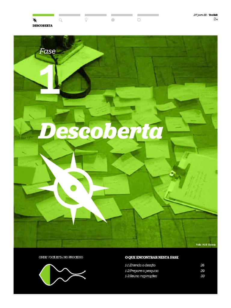 Descobertas constroem uma base slida para suas ideias. Criar solues significativas para estudantes, pais e familiares, professores, colegas e gestores comea com um profundo entendimento de suas necessidades. Descoberta significa estar aberto a novas oportunidades, inspirar-se e criar novas ideias. Com a preparao correta, essa fase pode ser um abrir de olhos e vai proporcionar um bom entendimento do desafio.