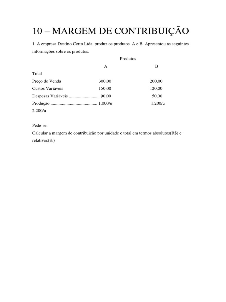 Calcular a margem de contribuio por unidade e total em termos absolutos(R$) e