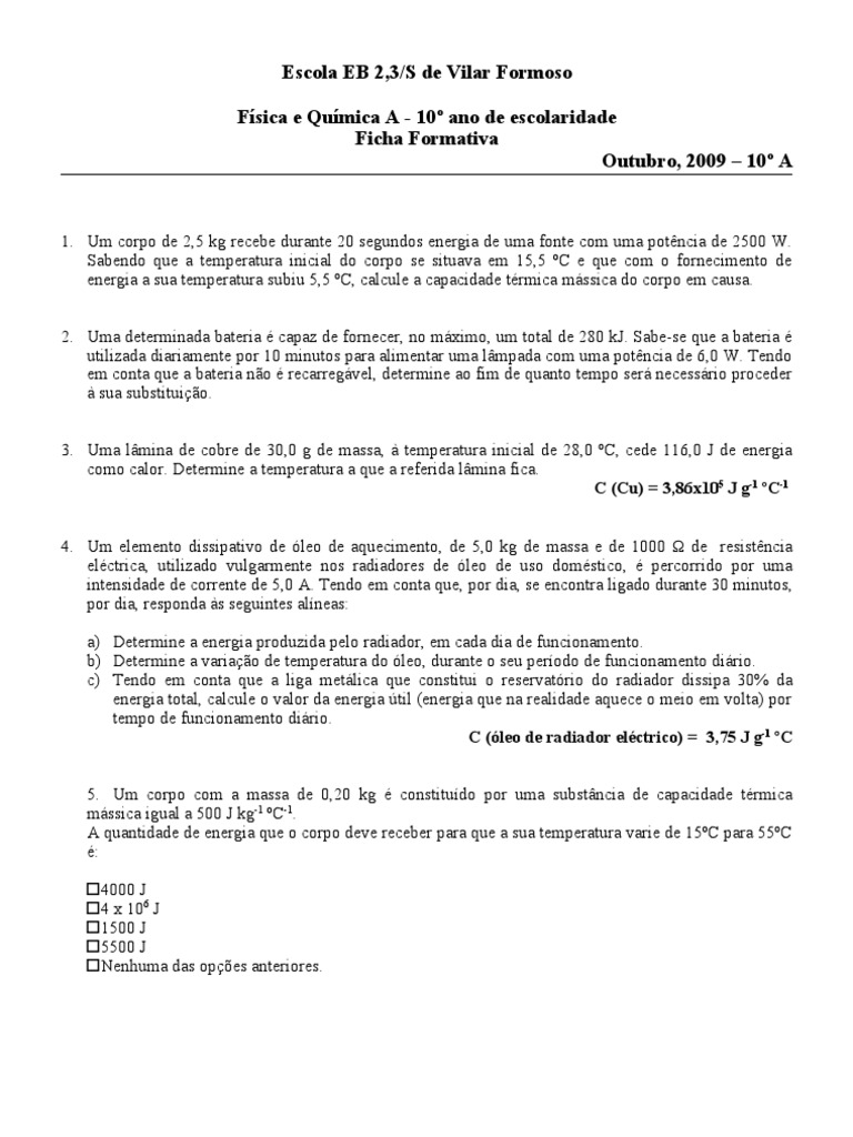 5. Um corpo com a massa de 0,20 kg é constituído por uma substância de capacidade térmica