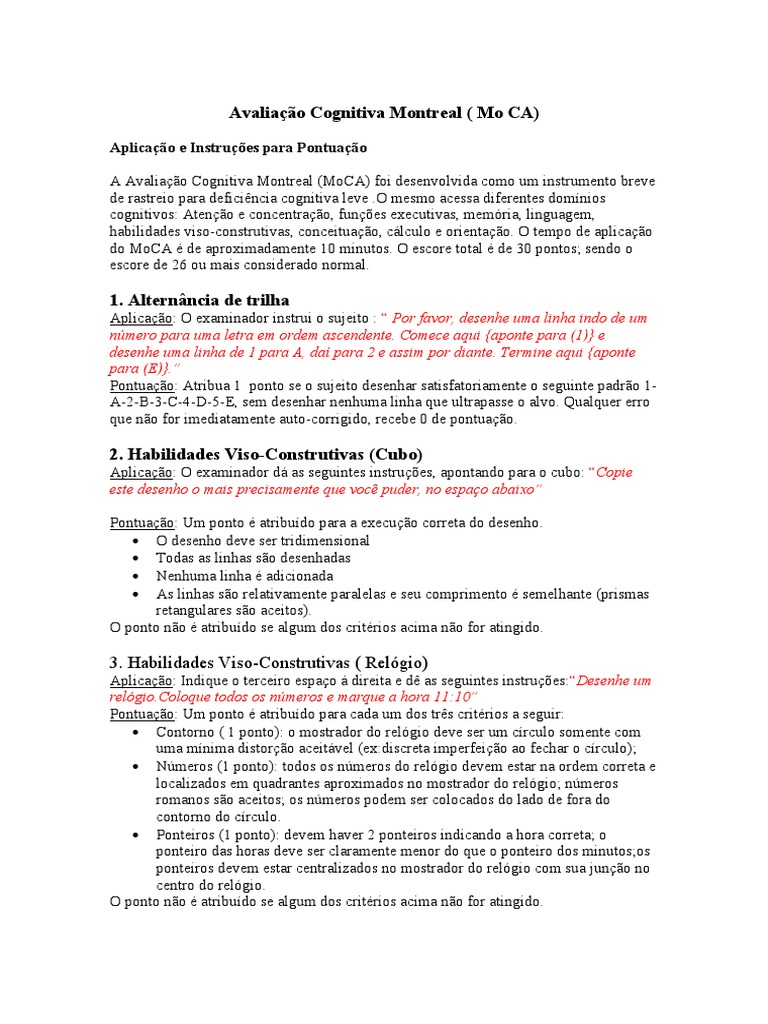 do MoCA de aproximadamente 10 minutos. O escore total de 30 pontos; sendo o