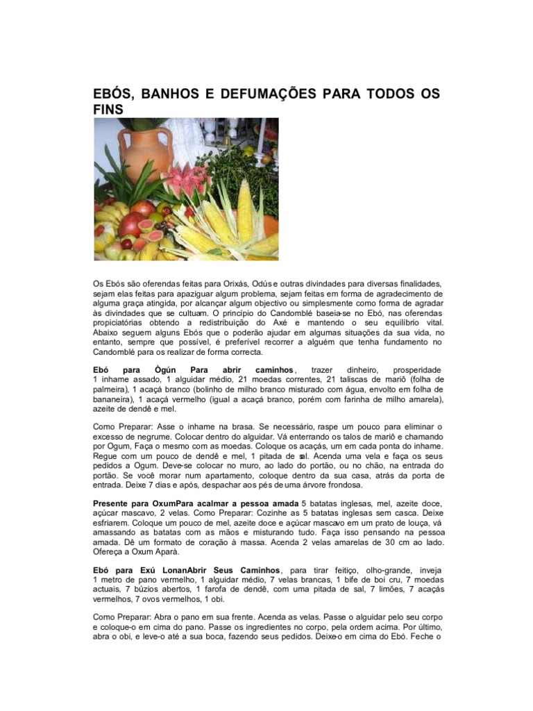 Os Ebs so oferendas feitas para Orixs, Ods e outras divindades para diversas finalidades,