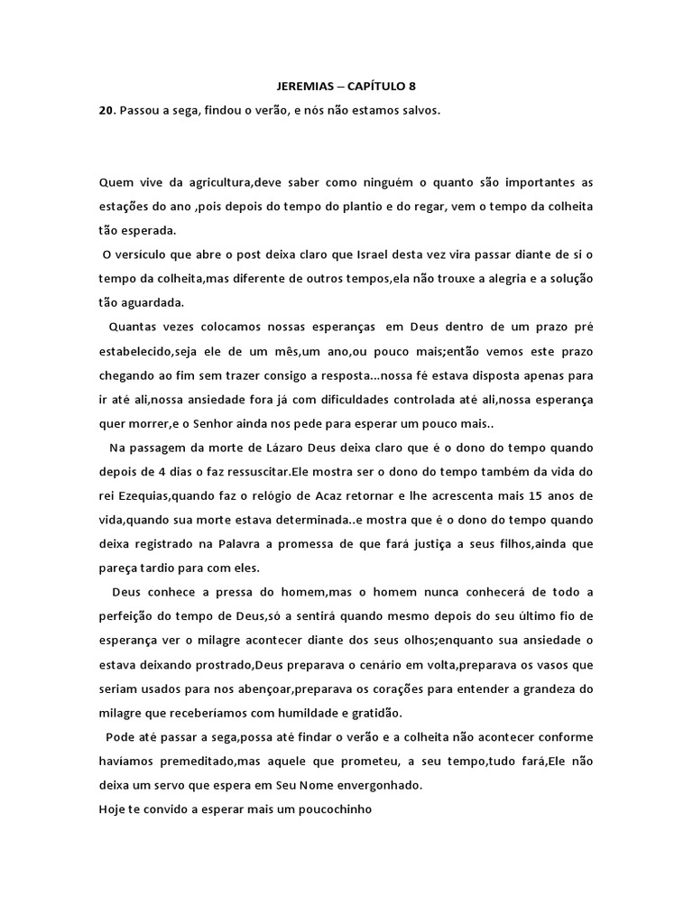 Quem vive da agricultura,deve saber como ningum o quanto so importantes as estaes do ano ,pois depois do tempo do plantio e do regar, vem o tempo da colheita to esperada. O versculo que abre o post deixa claro que Israel desta vez vira passar diante de si o tempo da colheita,mas diferente de outros tempos,ela no trouxe a alegria e a soluo to aguardada. Quantas vezes colocamos nossas esperanas em Deus dentro de um prazo pr estabelecido,seja ele de um ms,um ano,ou pouco mais;ento vemos este prazo chegando ao fim sem trazer consigo a resposta...nossa f estava disposta apenas para ir at ali,nossa ansiedade fora j com dificuldades controlada at ali,nossa esperana quer morrer,e o Senhor ainda nos pede para esperar um pouco mais.. Na passagem da morte de Lzaro Deus deixa claro que o dono do tempo quando depois de 4 dias o faz ressuscitar.Ele mostra ser o dono do tempo tambm da vida do rei Ezequias,quando faz o relgio de Acaz retornar e lhe acrescenta mais 15 anos de vida,quando sua morte estava determinada..e mostra que o dono do tempo quando deixa registrado na Palavra a promessa de que far justia a seus filhos,ainda que parea tardio para com eles. Deus conhece a pressa do homem,mas o homem nunca conhecer de todo a perfeio do tempo de Deus,s a sentir quando mesmo depois do seu ltimo fio de esperana ver o milagre acontecer diante dos seus olhos;enquanto sua ansiedade o estava deixando prostrado,Deus preparava o cenrio em volta,preparava os vasos que seriam usados para nos abenoar,preparava os coraes para entender a grandeza do milagre que receberamos com humildade e gratido. Pode at passar a sega,possa at findar o vero e a colheita no acontecer conforme havamos premeditado,mas aquele que prometeu, a seu tempo,tudo far,Ele no deixa um servo que espera em Seu Nome envergonhado. Hoje te convido a esperar mais um poucochinho Porque ainda um poucochinho de tempo, E o que h de vir vir, e no tardar.Hebreus 10:37, a esticar a corda no limite da sua f,a no perder a cabea ferindo a Rocha como Moiss fez no deserto por presso,a no duvidar como fez Israel ao espiar a terra Prometida,a fim de no perder a bno......Fiel aquele que prometeu.E os reis sero os teus aios, e as suas rainhas as tuas amas; diante de ti se inclinaro com o rosto em terra, e lambero o p dos teus ps; e sabers que eu sou o SENHOR, que os que confiam em mim no sero confundidos.Isaas 49:23 *Abrao e paz! orao de hoje: Senhor,confesso que me sinto frustrado(a),pois eu acreditava j ser hora de realizar a promessa feita a muito tempo;mas passou a sega,findou o vero e ainda no estou salvo(a),ajuda-me a perseverar crendo apesar da minha frustrao e vergonha,socorre-me ,livra-me,pois tenho sede da justia e do cumprimento da Tua Palavra,em nome de Jesus,amm.