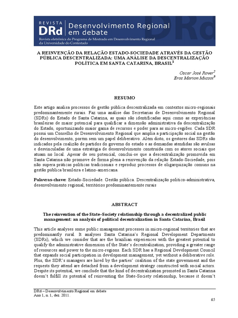 Palavras-chave: Estado-Sociedade. Gesto pblica. Descentralizao politico-administrativa,