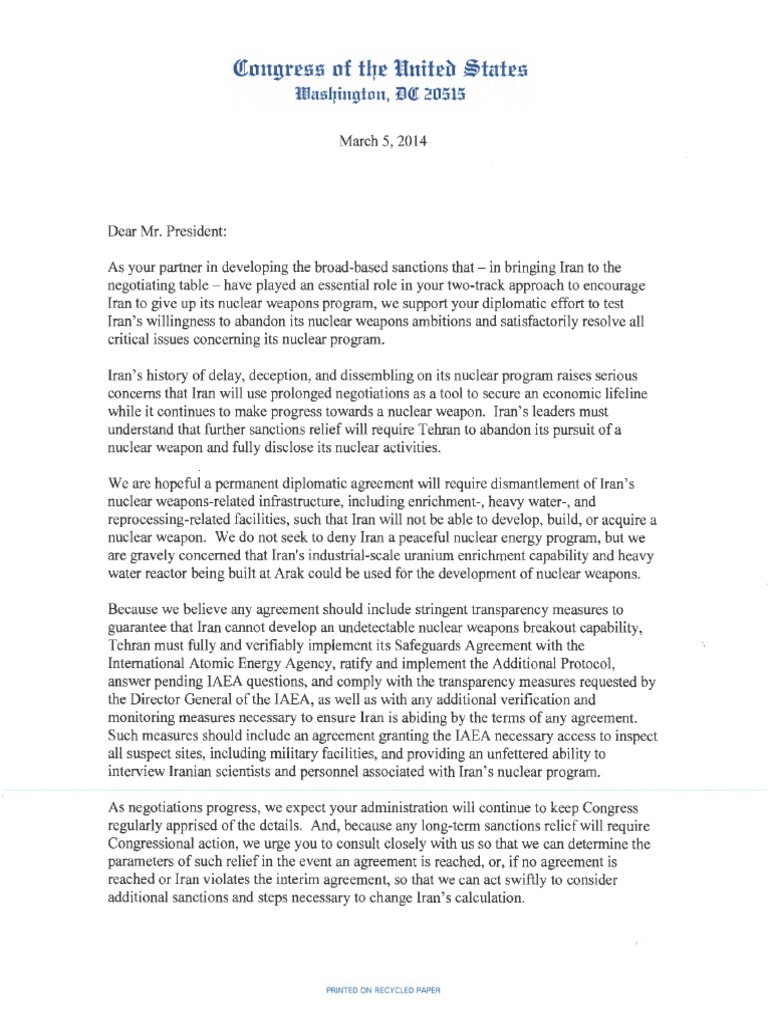 March 5, 2014 As your partner in developing the broad-based sanctions that -in bringing Iran to the negotiating table -have played an essential role in your two-track approach to encourage Iran to give up its nuclear weapons program, we support your diplomatic effort to test