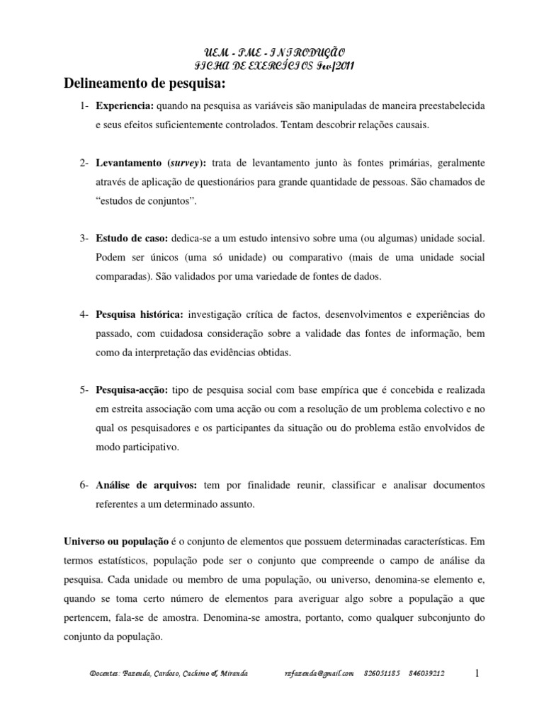 1- Experiencia: quando na pesquisa as variveis so manipuladas de maneira preestabelecida