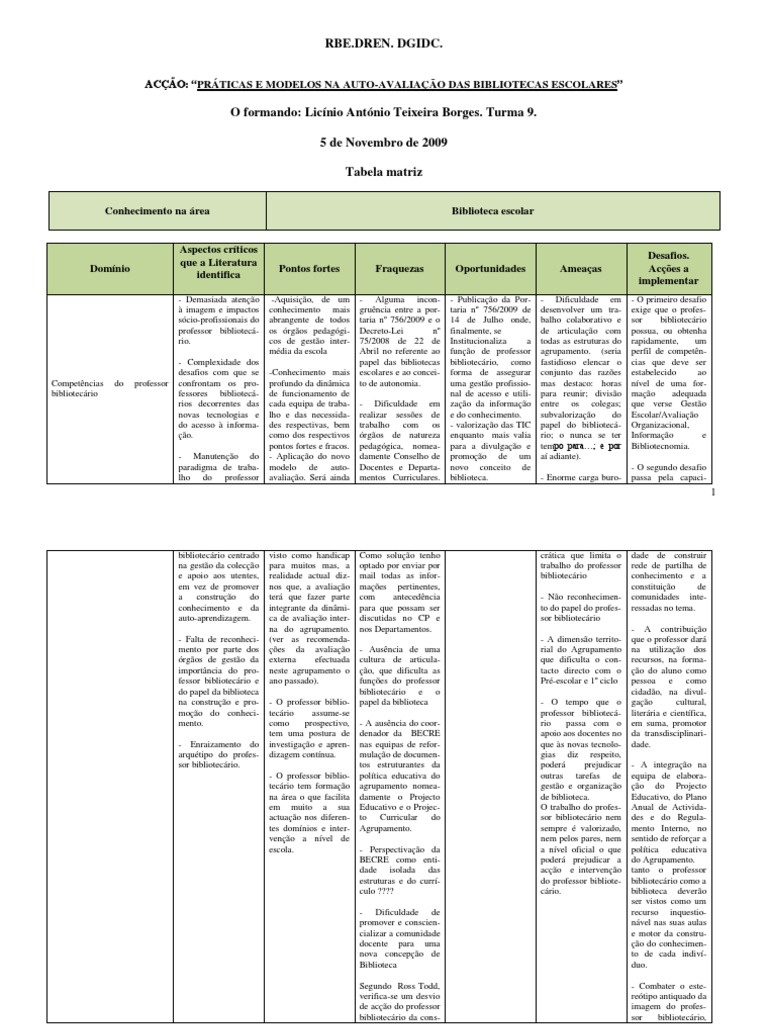 possua, ou obtenha rapidamente, um perfil de competên- cias que deve ser estabelecido ao nível de uma for- mação adequada que verse Gestão Escolar/Avaliação Organizacional, Informação e Bibliotecnomia. |