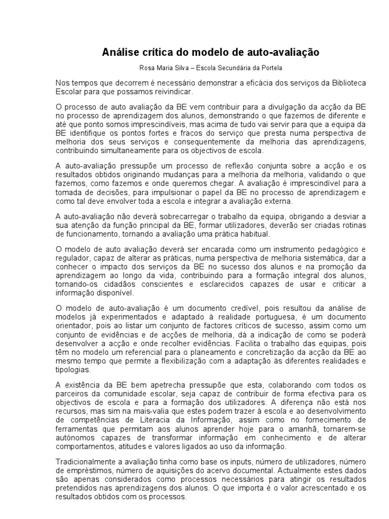 conseguir a melhoria. O processo de auto-avaliação deverá implicar a reflexão de toda a