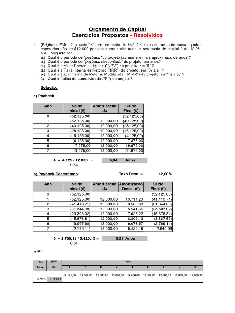 1. (Brigham, FM) - O projeto K tem um custo de $52.125, suas entradas de caixa lquidas