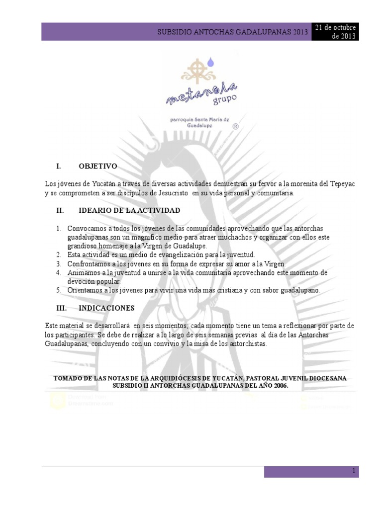 Se ira pasando la antorcha (apagada) a cada uno y dira la razón por la que va a correr. IV. TEMA: “AYATE DE JUAN DIEGO” SE MUESTRA EL POWERPOINT ADJUNTO. BIENVENIDA REALIZADA POR LA COORDINACION DE LA ANTORCHA ( LOCAL) V. DINÁMICA DE LA ANTORCHA Requerimientos: LA ANTORCHA QUE SE VA A USAR EN EL RECORRIDO. II. Piensa lo que mas te llamo la atención de los datos de las diapositivas. 20 . III. El testimonio se puede dar voluntario. AMBIENTACION Imagen grande de la virgen. VII. VIII. META Los jóvenes participantes se encuentran con las verdades del ayate de la virgen de Guadalupe. como símbolo de acercamiento de Dios para los mexicanos y el pueblo no convertido. 2. VI. 3.SUBSIDIO ANTOCHAS GADALUPANAS 2013 21 de octubre de 2013 QUINTO DIA I. ORACION INICIAL DADA POR EL ANTORCHISTA CON MAS AÑOS CORRIENDO. Donde cada equipo dira sus impresiones del ppt. Complementación: A cada uno de los participantes se le dara estas instrucciones: 1. Para no prolongar mucho la actividad se puede realizarse por equipos. ORACION FINAL El equipo organizador prepara la oración Final. LOCAL Preparado para ver diapositivas.