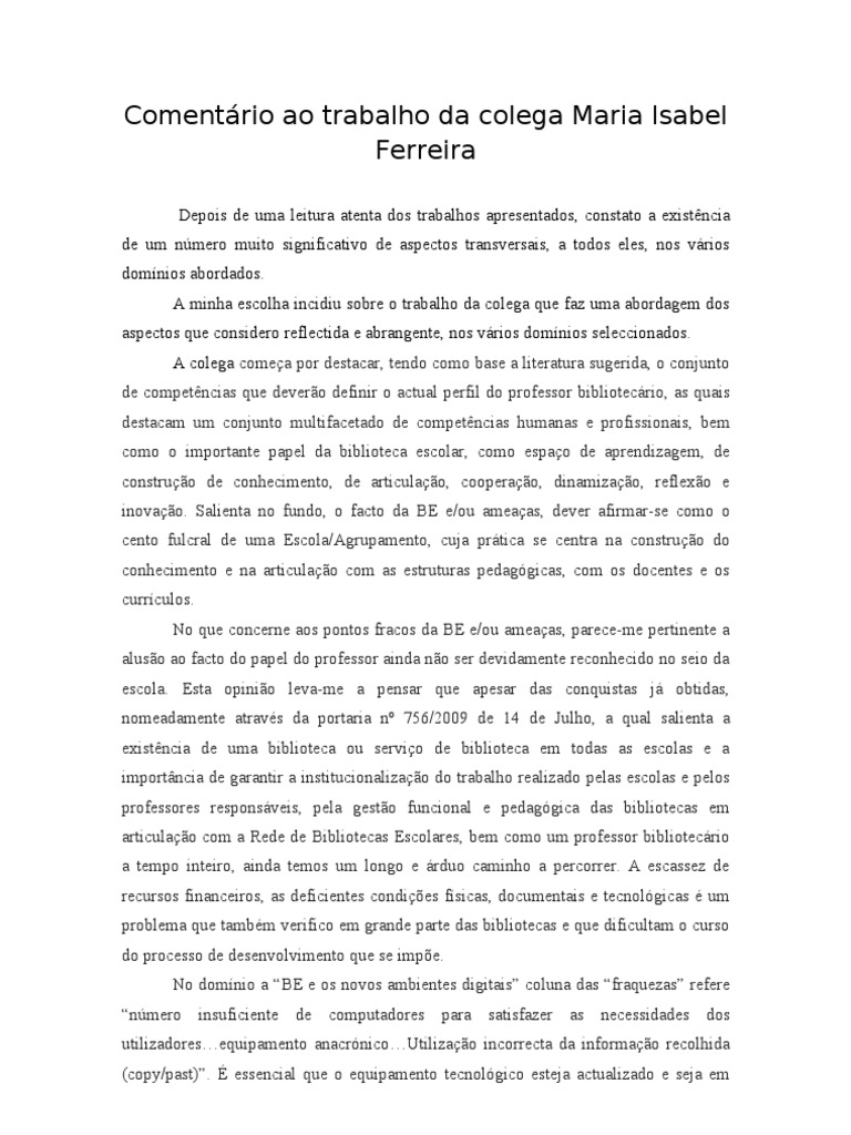 Comentário ao trabalho da colega Maria Isabel
