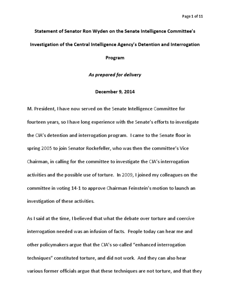 Statement of Senator Ron Wyden on the Senate Intelligence Committee’s Investigation of the Central Intelligence Agency’s Detention and Interrogation Program