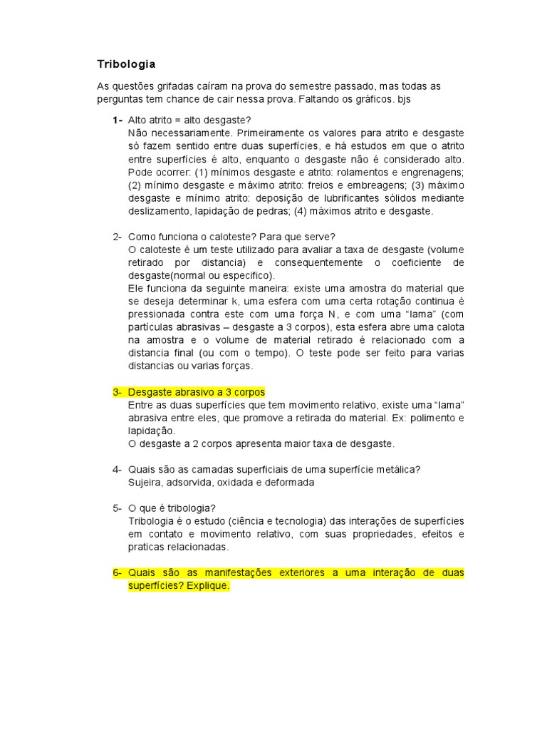 perguntas tem chance de cair nessa prova. Faltando os grficos. bjs 1- Alto atrito = alto desgaste? No necessariamente. Primeiramente os valores para atrito e desgaste s fazem sentido entre duas superfcies, e h estudos em que o atrito entre superfcies alto, enquanto o desgaste no considerado alto. Pode ocorrer: (1) mnimos desgaste e atrito: rolamentos e engrenagens; (2) mnimo desgaste e mximo atrito: freios e embreagens; (3) mximo desgaste e mnimo atrito: deposio de lubrificantes slidos mediante deslizamento, lapidao de pedras; (4) mximos atrito e desgaste. 2- Como funciona o caloteste? Para que serve? O caloteste um teste utilizado para avaliar a taxa de desgaste (volume retirado por distancia) e consequentemente o coeficiente de desgaste(normal ou especifico). Ele funciona da seguinte maneira: existe uma amostra do material que se deseja determinar k, uma esfera com uma certa rotao continua pressionada contra este com uma fora N, e com uma lama (com partculas abrasivas desgaste a 3 corpos), esta esfera abre uma calota na amostra e o volume de material retirado relacionado com a distancia final (ou com o tempo). O teste pode ser feito para varias distancias ou varias foras. 3- Desgaste abrasivo a 3 corpos Entre as duas superfcies que tem movimento relativo, existe uma lama abrasiva entre eles, que promove a retirada do material. Ex: polimento e lapidao. O desgaste a 2 corpos apresenta maior taxa de desgaste. 4- Quais so as camadas superficiais de uma superfcie metlica? Sujeira, adsorvida, oxidada e deformada 5- O que tribologia? Tribologia o estudo (cincia e tecnologia) das interaes de superfcies em contato e movimento relativo, com suas propriedades, efeitos e praticas relacionadas. 6- Quais so as manifestaes exteriores a uma interao de duas superfcies? Explique.