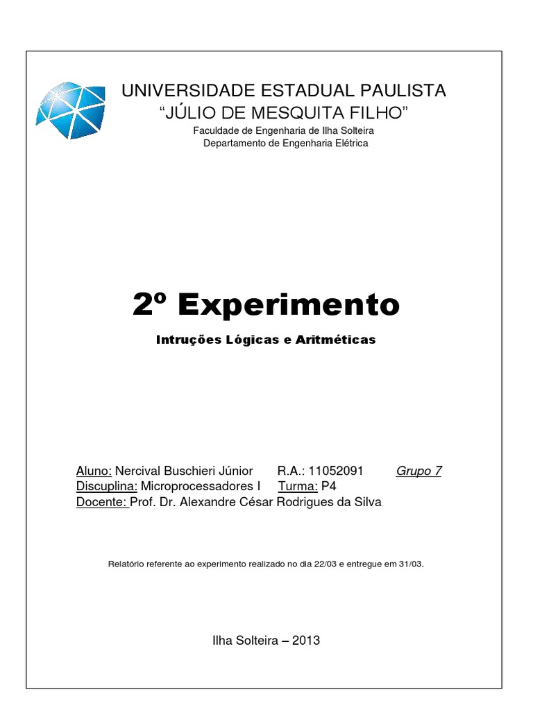 Relatrio referente ao experimento realizado no dia 22/03 e entregue em 31/03.