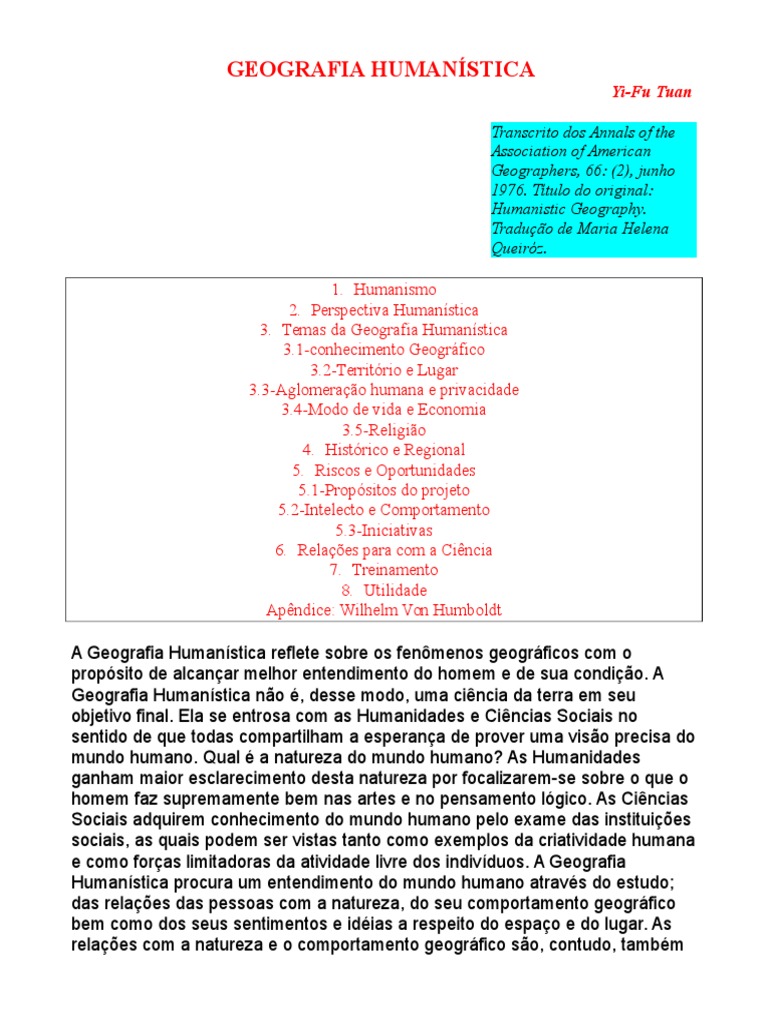 da conscientizao e do conhecimento humano. A Geografia Humanstica, em
