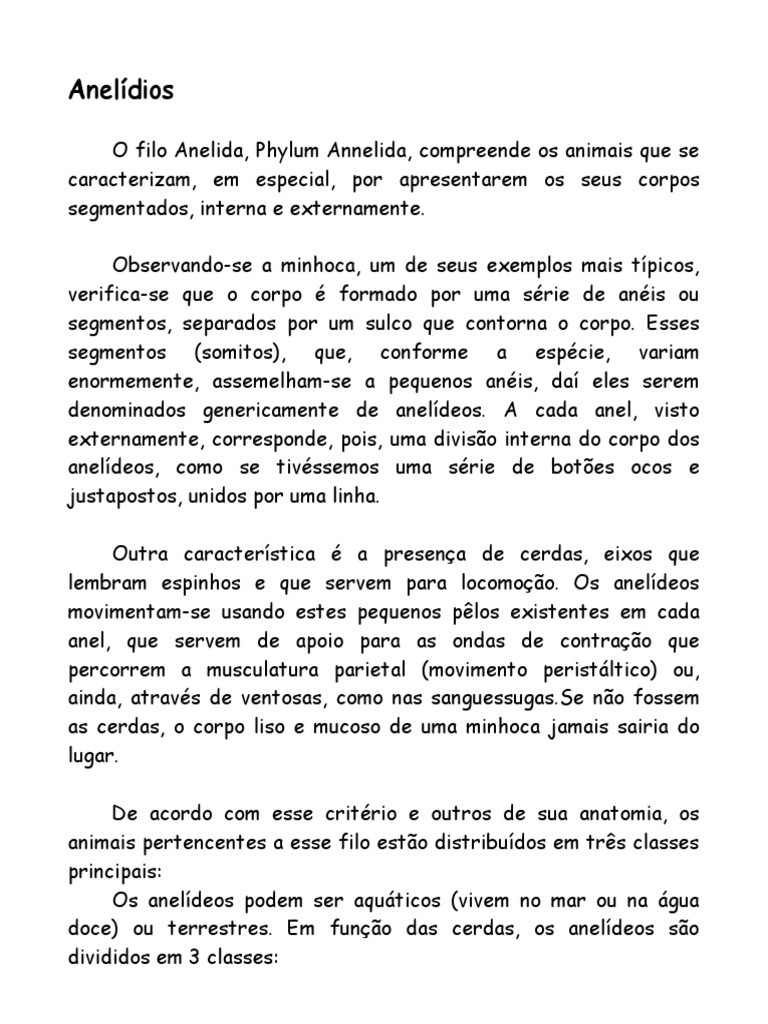 poucos plos por segmentos, compreendendo as minhocas e formas