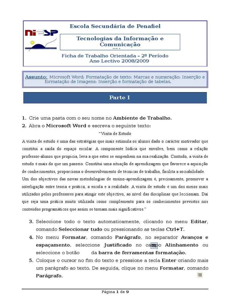 9. Seleccione o texto. Clique no menu Formatar, comando Pargrafo, em