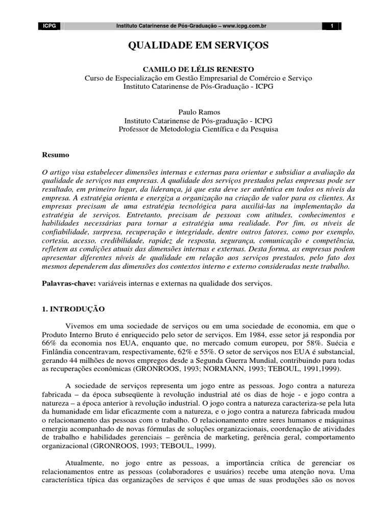 Palavras-chave: variveis internas e externas na qualidade dos servios.
