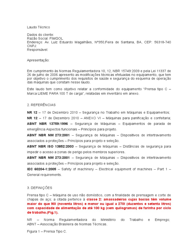 Este laudo tem como objetivo relatar a conformidade do equipamento Prensa tipo C