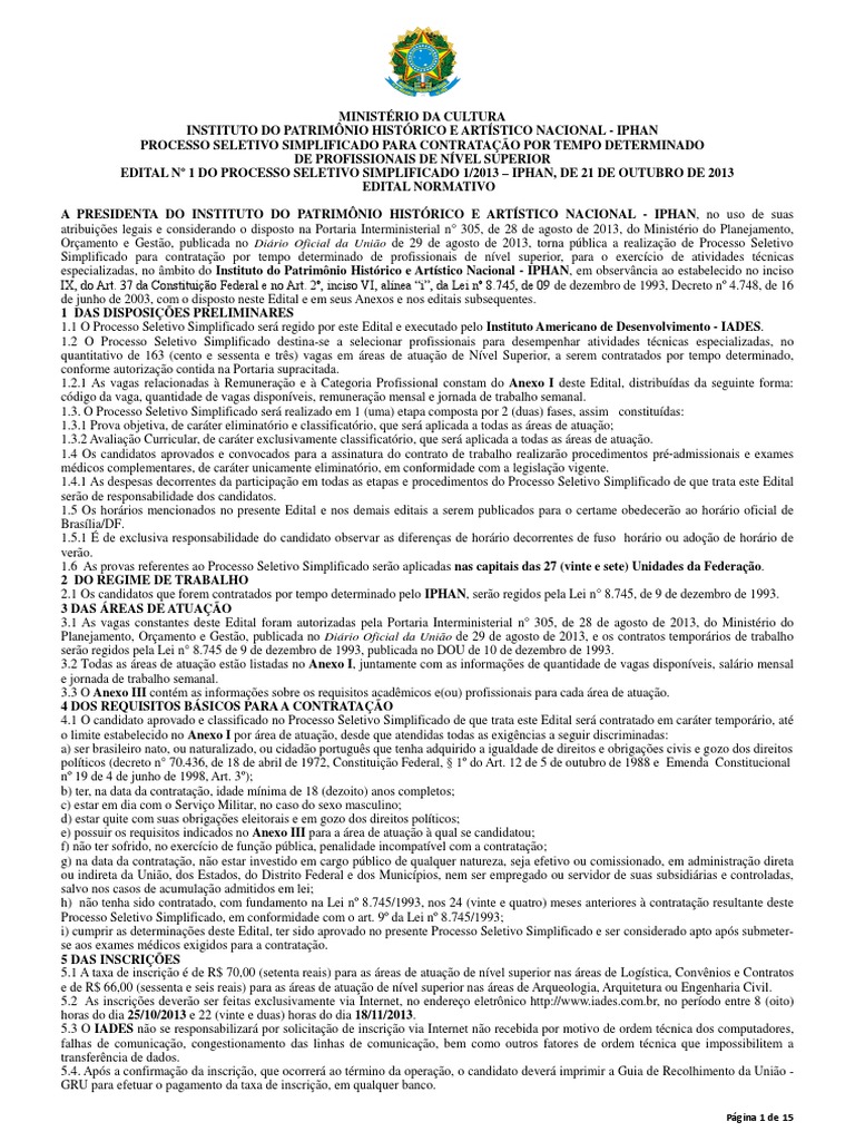 MINISTÉRIO DA CULTURA INSTITUTO DO PATRIMÔNIO HISTÓRICO E ARTÍSTICO NACIONAL - IPHAN PROCESSO SELETIVO SIMPLIFICADO PARA CONTRATAÇÃO POR TEMPO DETERMINADO DE PROFISSIONAIS DE NÍVEL SUPERIOR EDITAL Nº 1 DO PROCESSO SELETIVO SIMPLIFICADO 1/2013 – IPHAN, DE 21 DE OUTUBRO DE 2013 EDITAL NORMATIVO