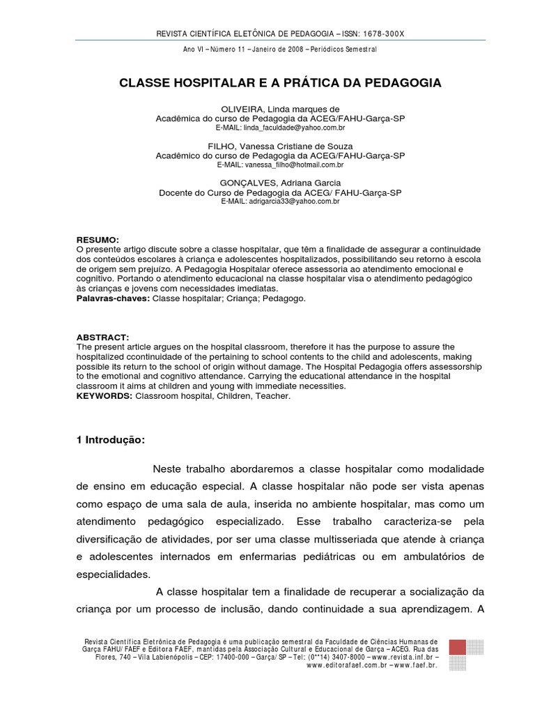 Palavras-chaves: Classe hospitalar; Criana; Pedagogo.